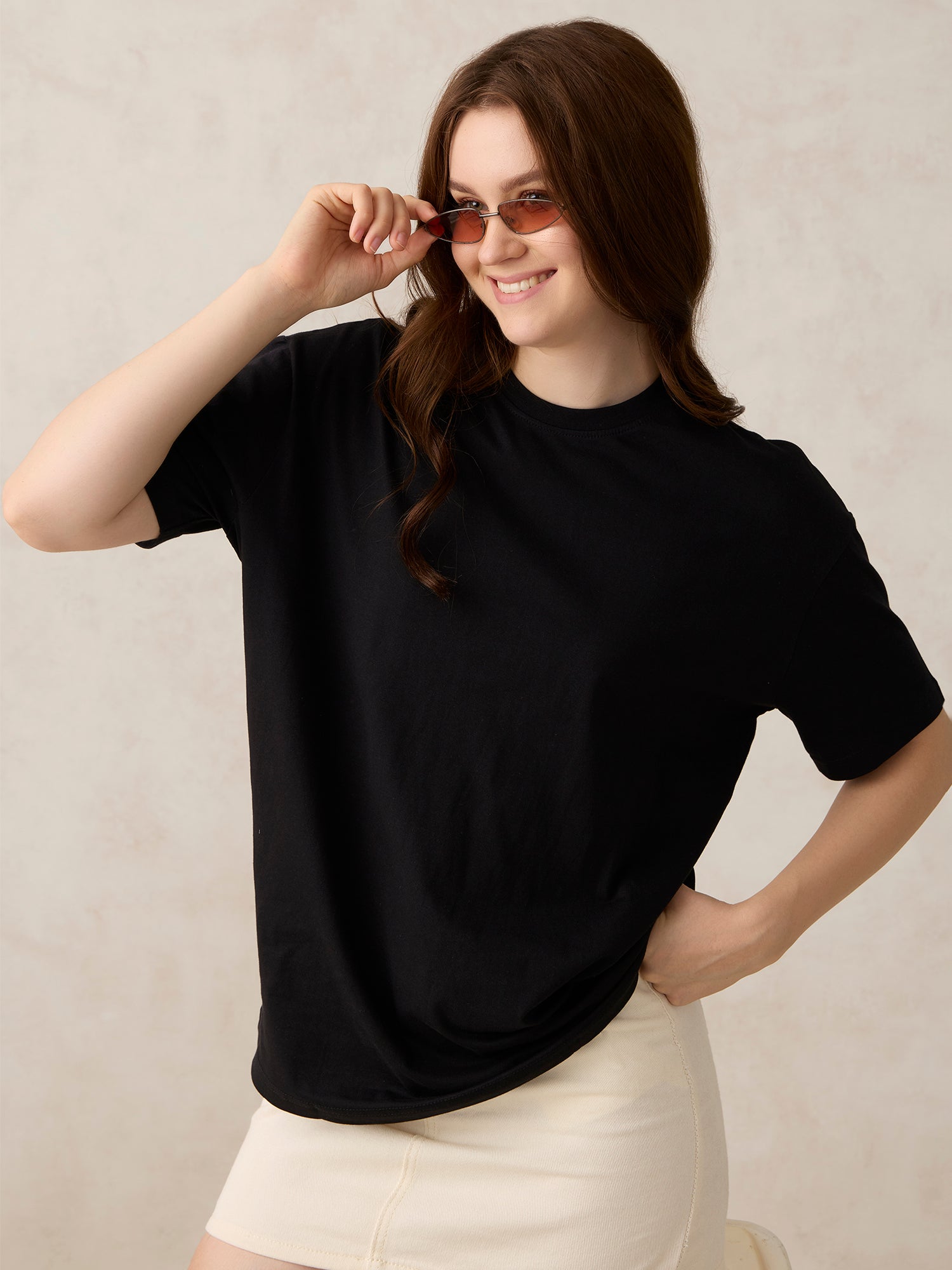 Heading out? The Black Crew Neck Solid Oversized T-Shirt has your back. The black shade gives it a standout look, and its oversized silhouette makes it ideal for everything from casual hangs to chill parties. Pair with your go-to kicks and you're good to go.