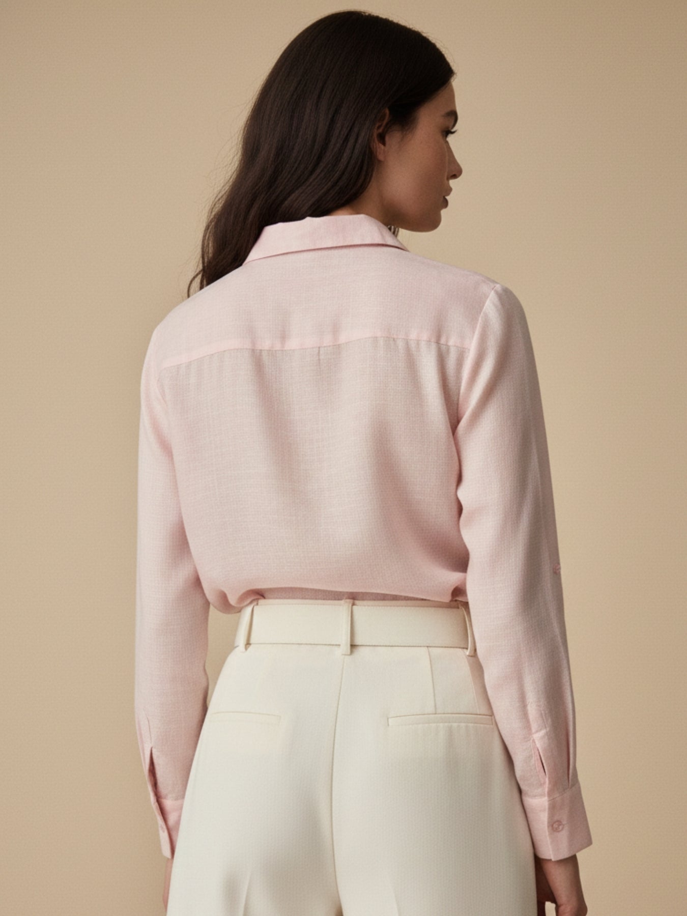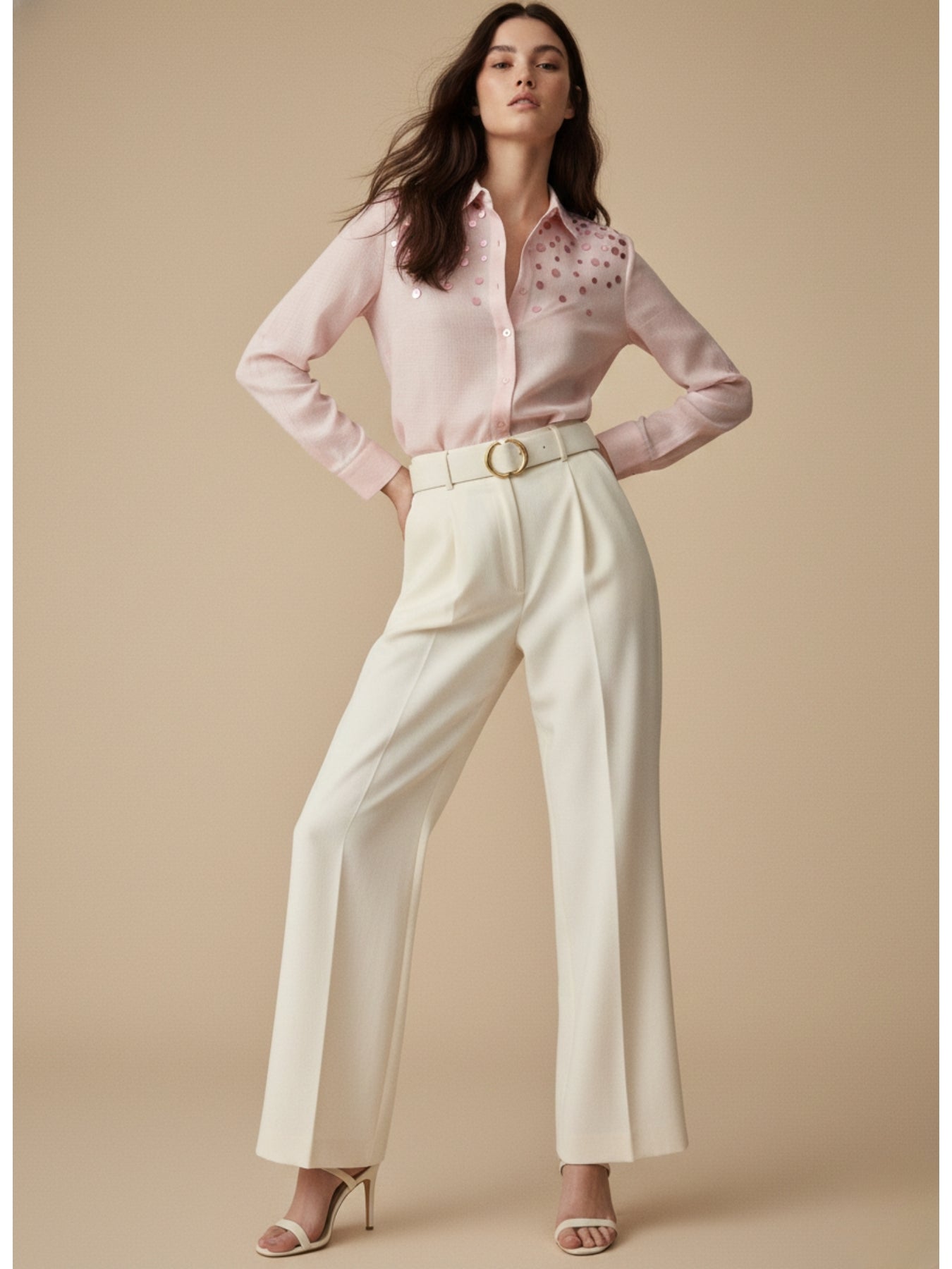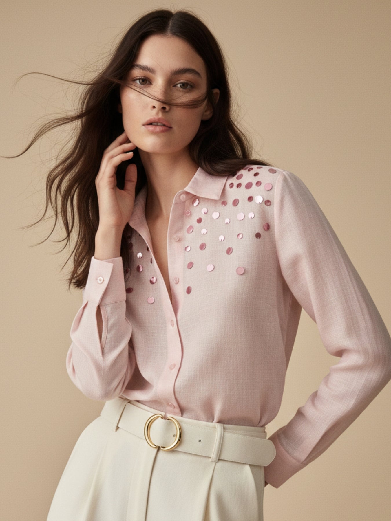 This elegant pink relaxed-fit shirt is subtly elevated with sophisticated sequin embellishments. It is an ideal choice for an evening dinner or a festive holiday party. Pair it with tailored pants for a polished look that works perfectly for a special office event.