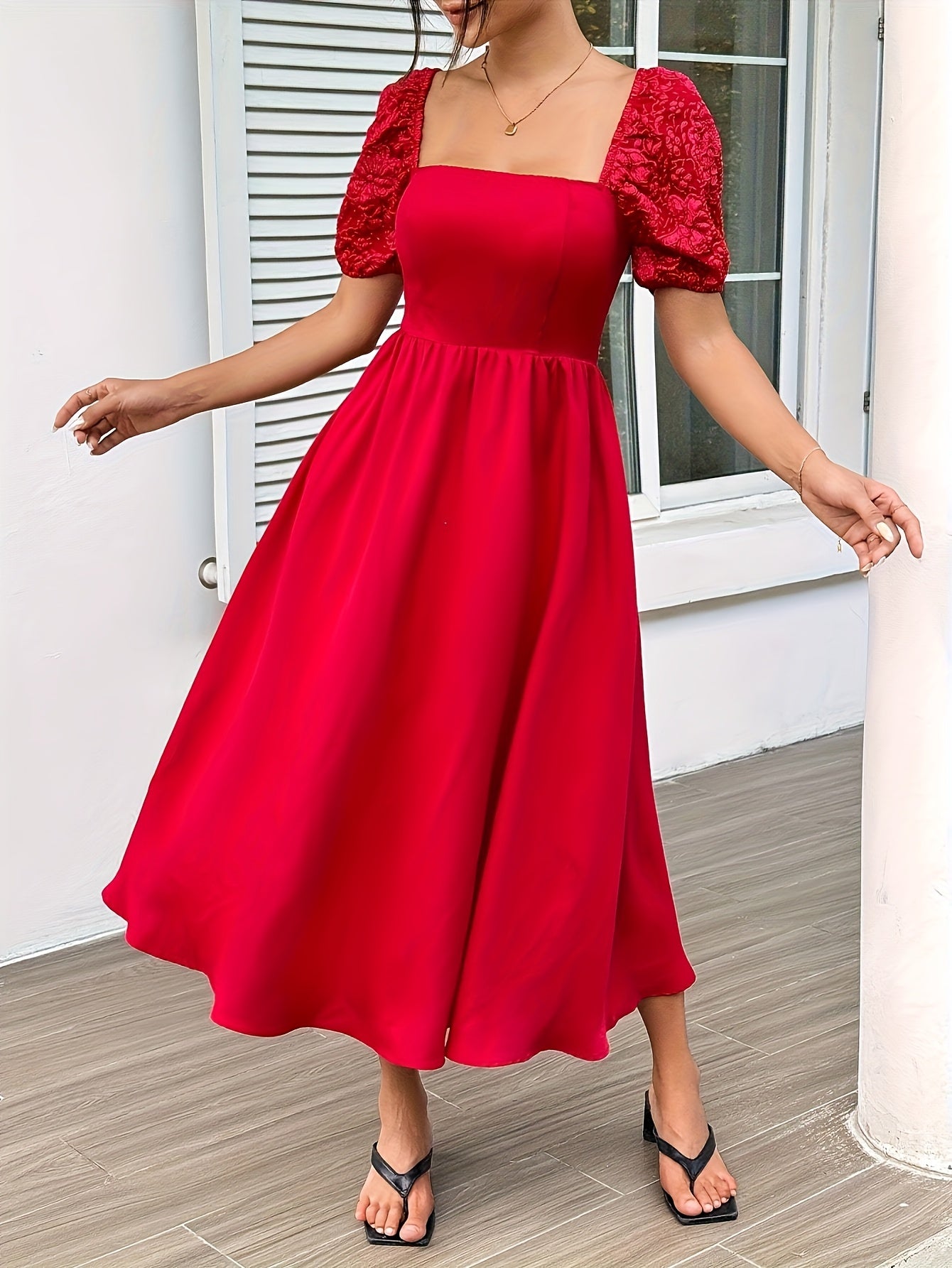 Red Midi Flared Dress With Jacquard Fabric At Sleeves
