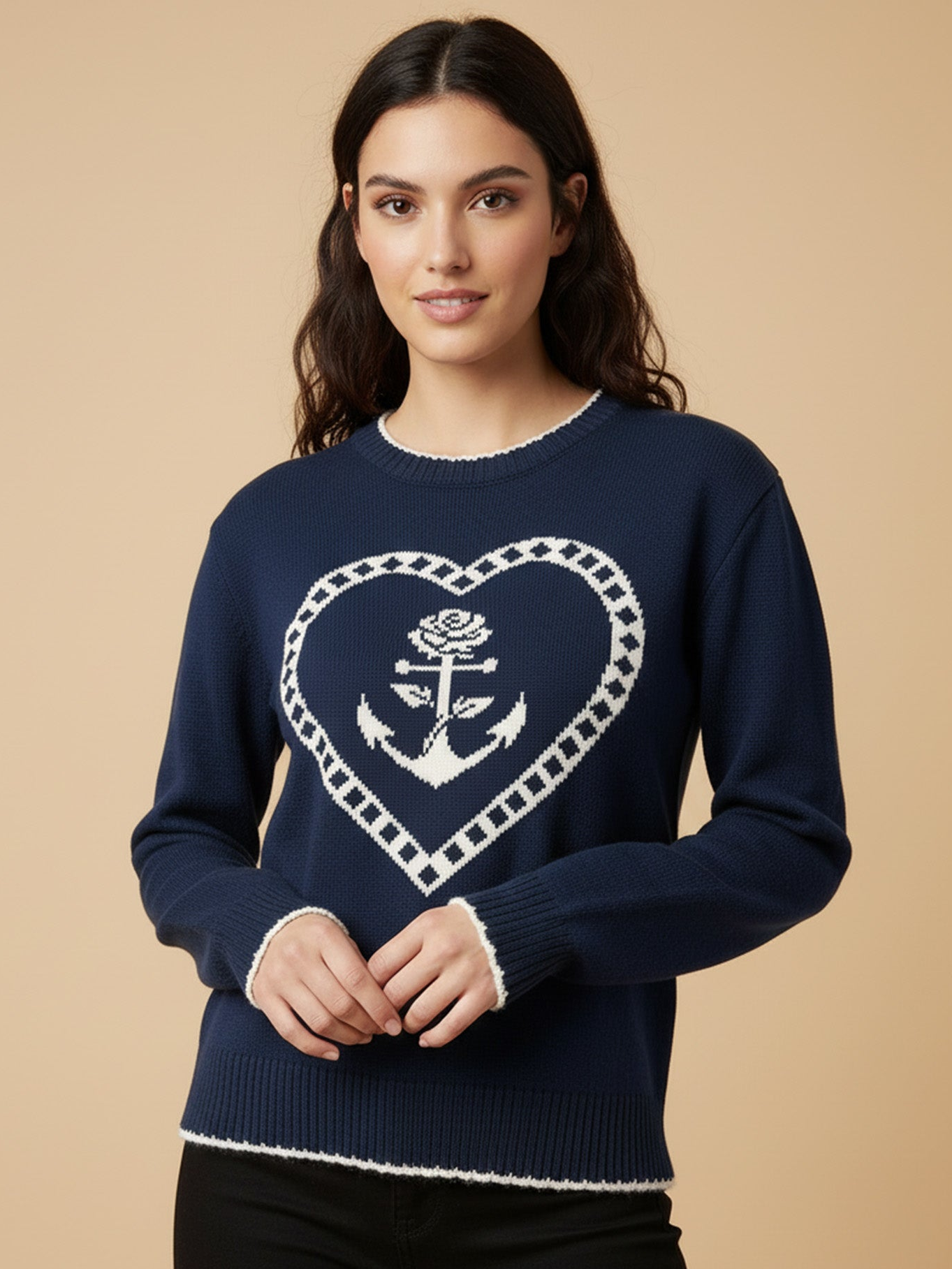 Navy Blue Contrast Stitch Hem And Neck With Graphic Sweater