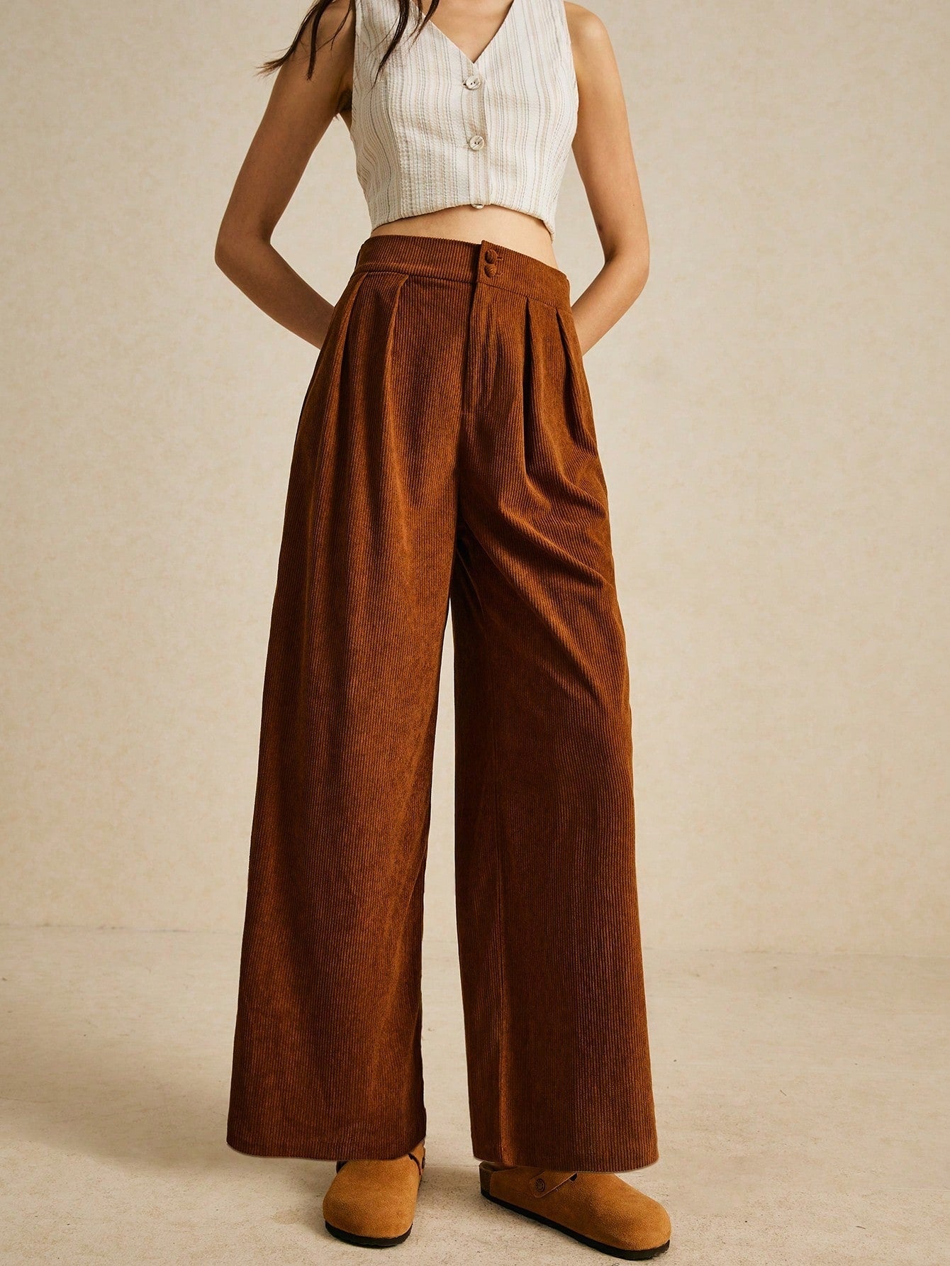 Brown Waist Buttoned Corduroy Pant