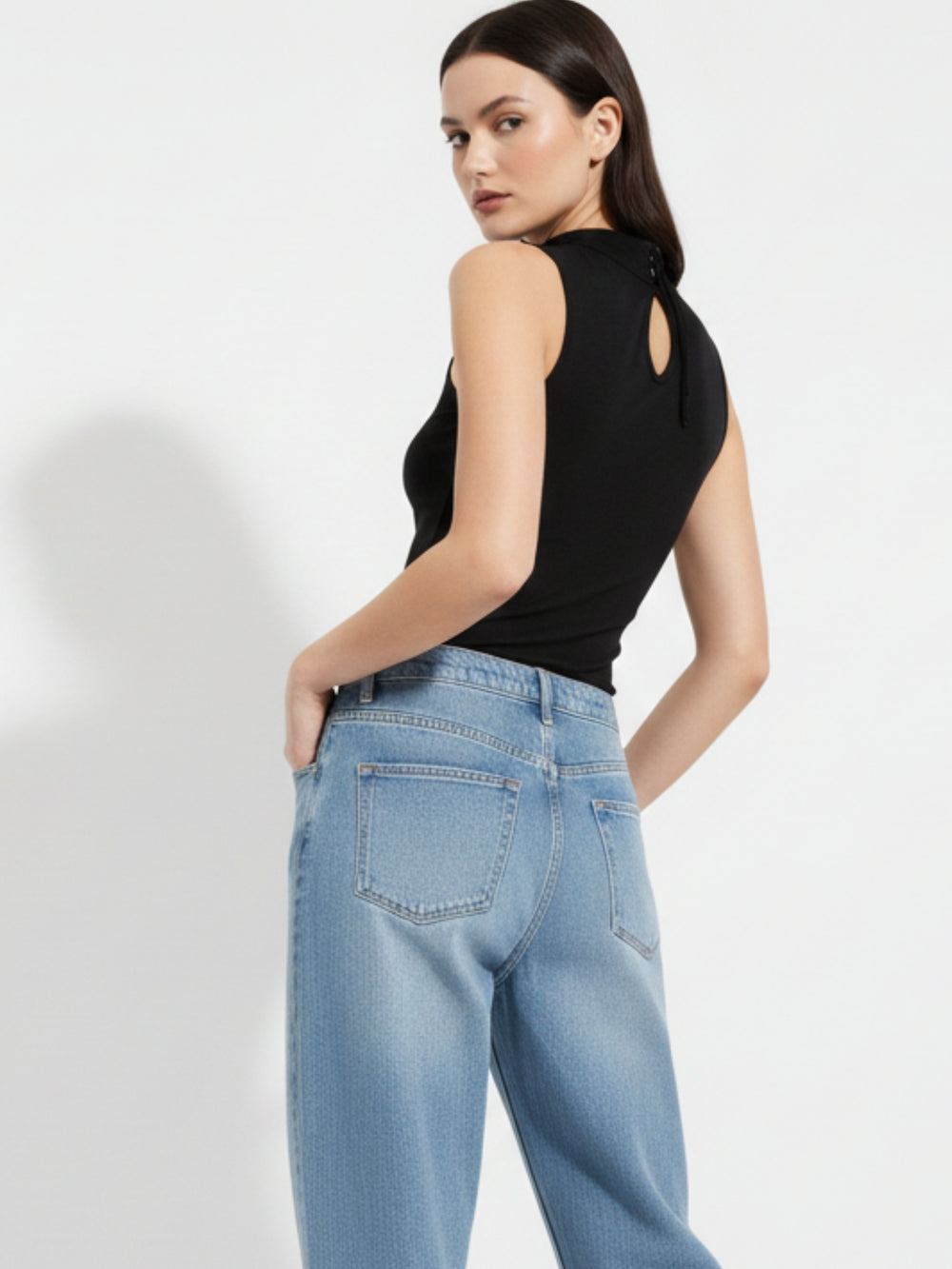 This black sleeveless high neck fitted top is a sleek and modern essential. It’s perfect for creating a chic evening look or as a base layer for more complex outfits.