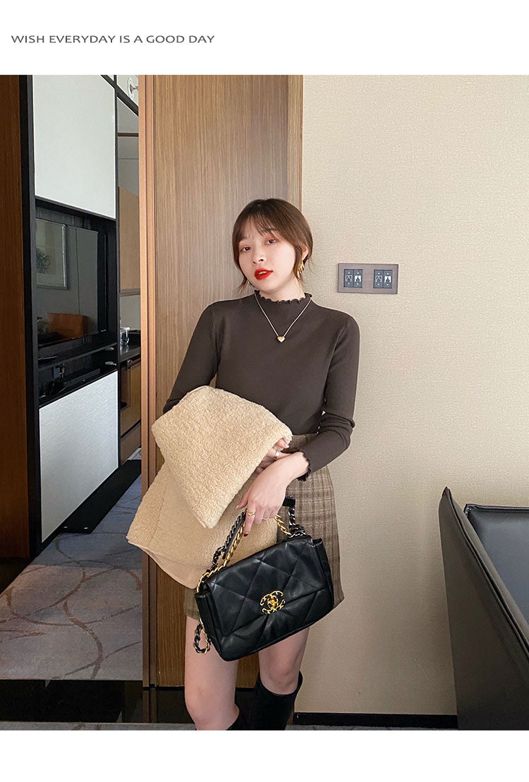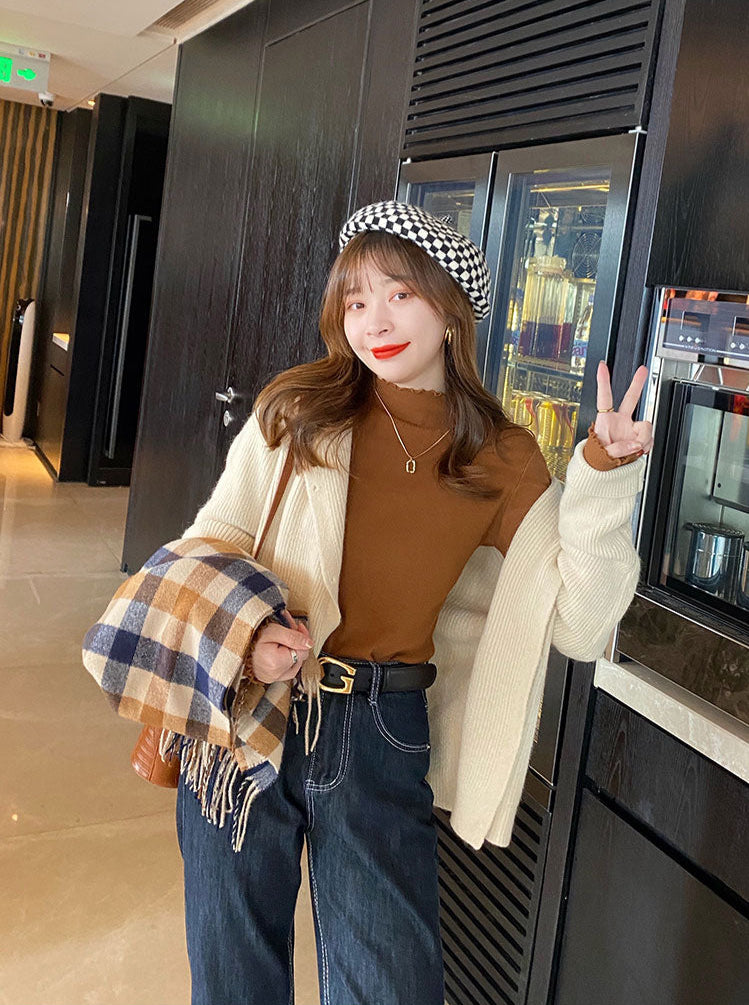 Brown Full Sleeve Scallop Hem Mock Neck Fitted Top