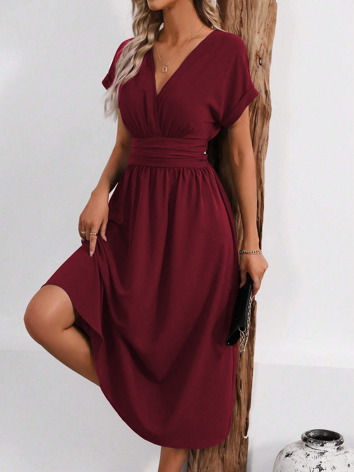 Wine Relaxed Fit Flared Dress With Embroidered On Yoke