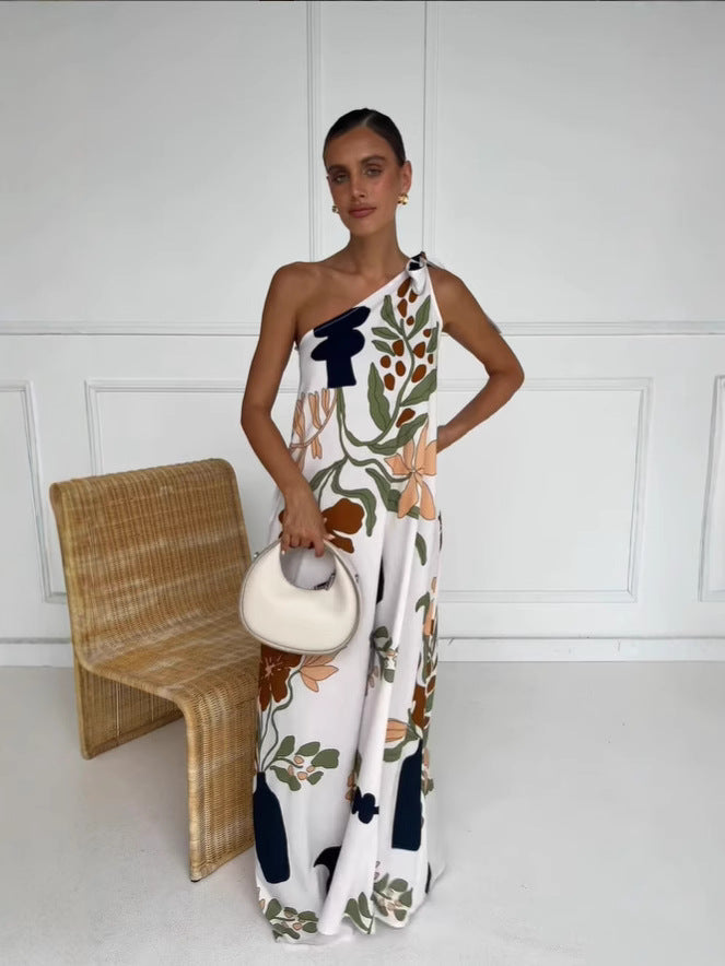 Red Abstract Print One Shoulder Tie-Up Dress