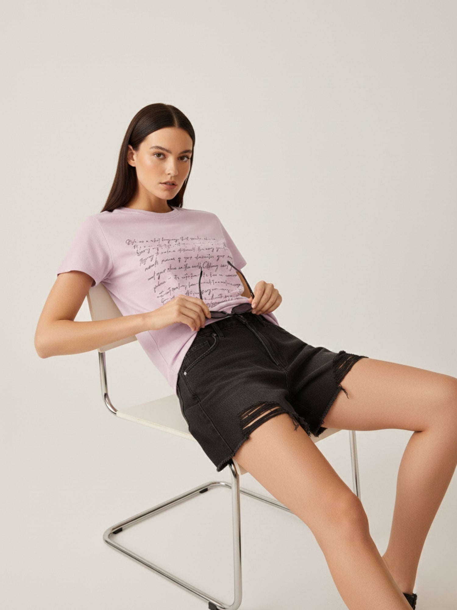 The Lilac Crew Neck Graphic T-Shirt is what your outfit plans have been waiting for. this casual wear plays well with both your everyday denim and late-night layers. Designed to be fuss-free and flattering.