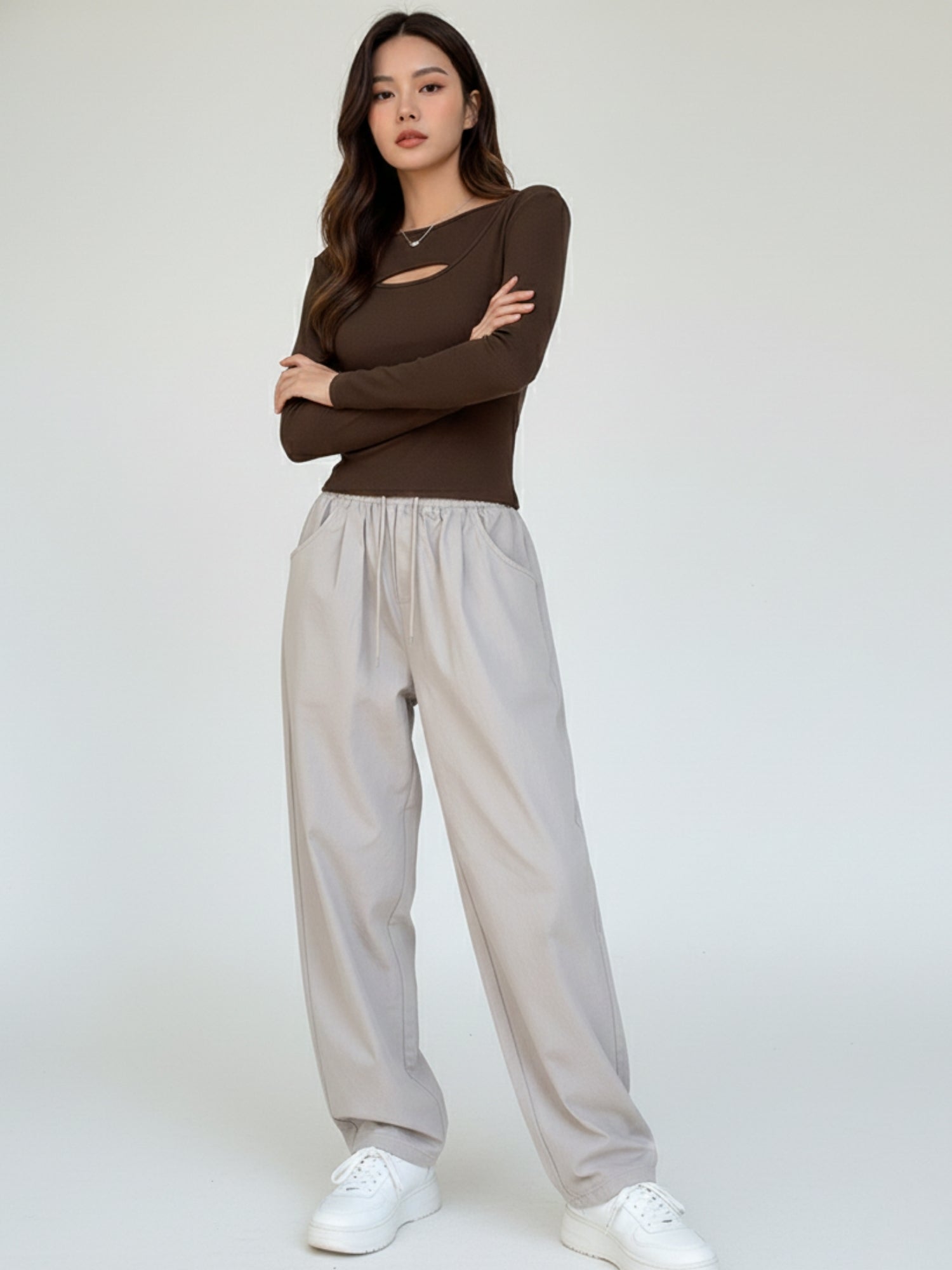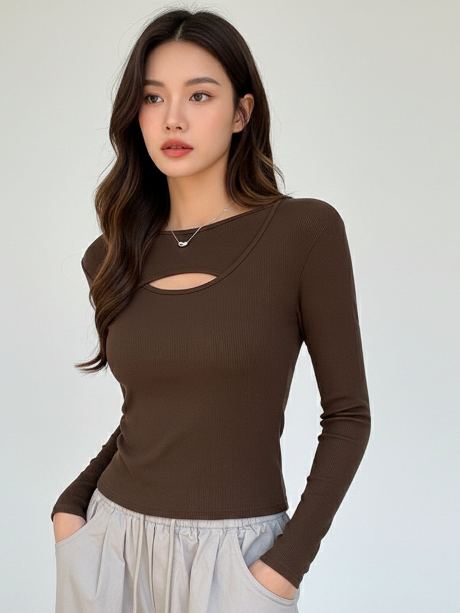 Brown Full Sleeve Neck Cut-Out Fitted Top