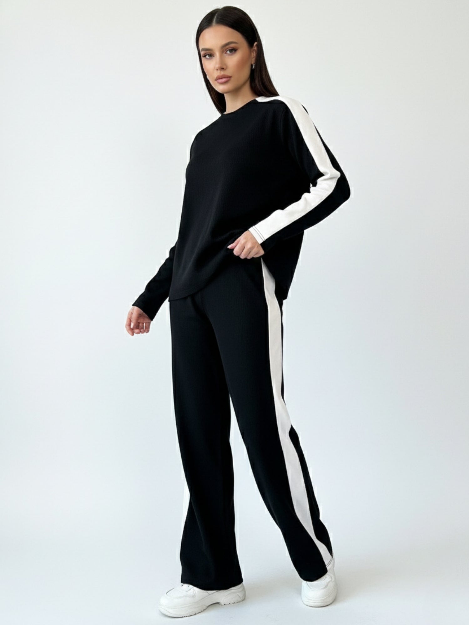 This black contrast-coloured striped top and pant co-ord set offers a masterclass in modern professional style. The sophisticated stripes and sleek matching silhouette make it ideal for business travel or office meetings. A versatile and refined matching set perfect for maintaining a polished look during semi-formal dinners. 10