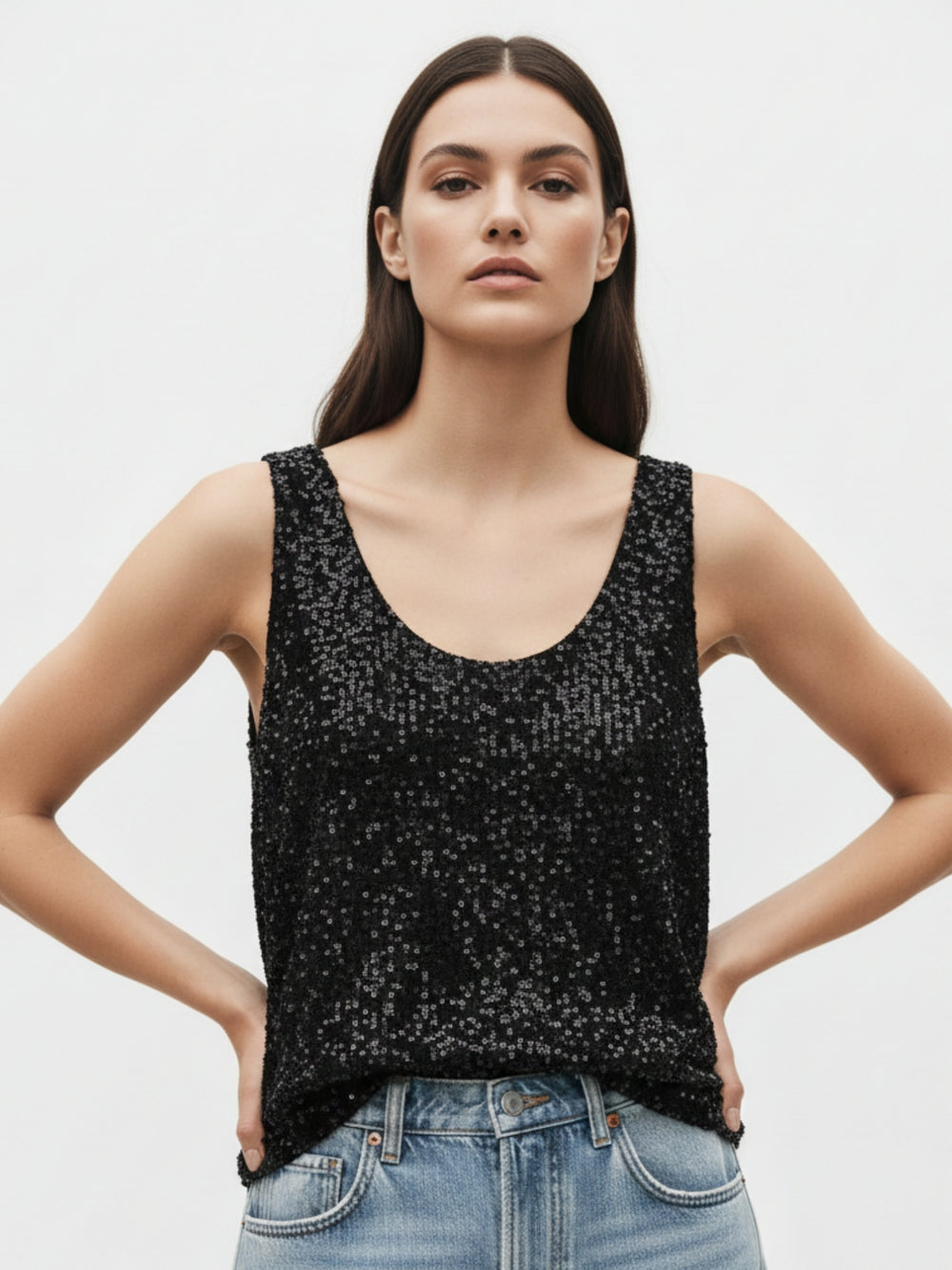 Black Shoulder Strap Sequined Top