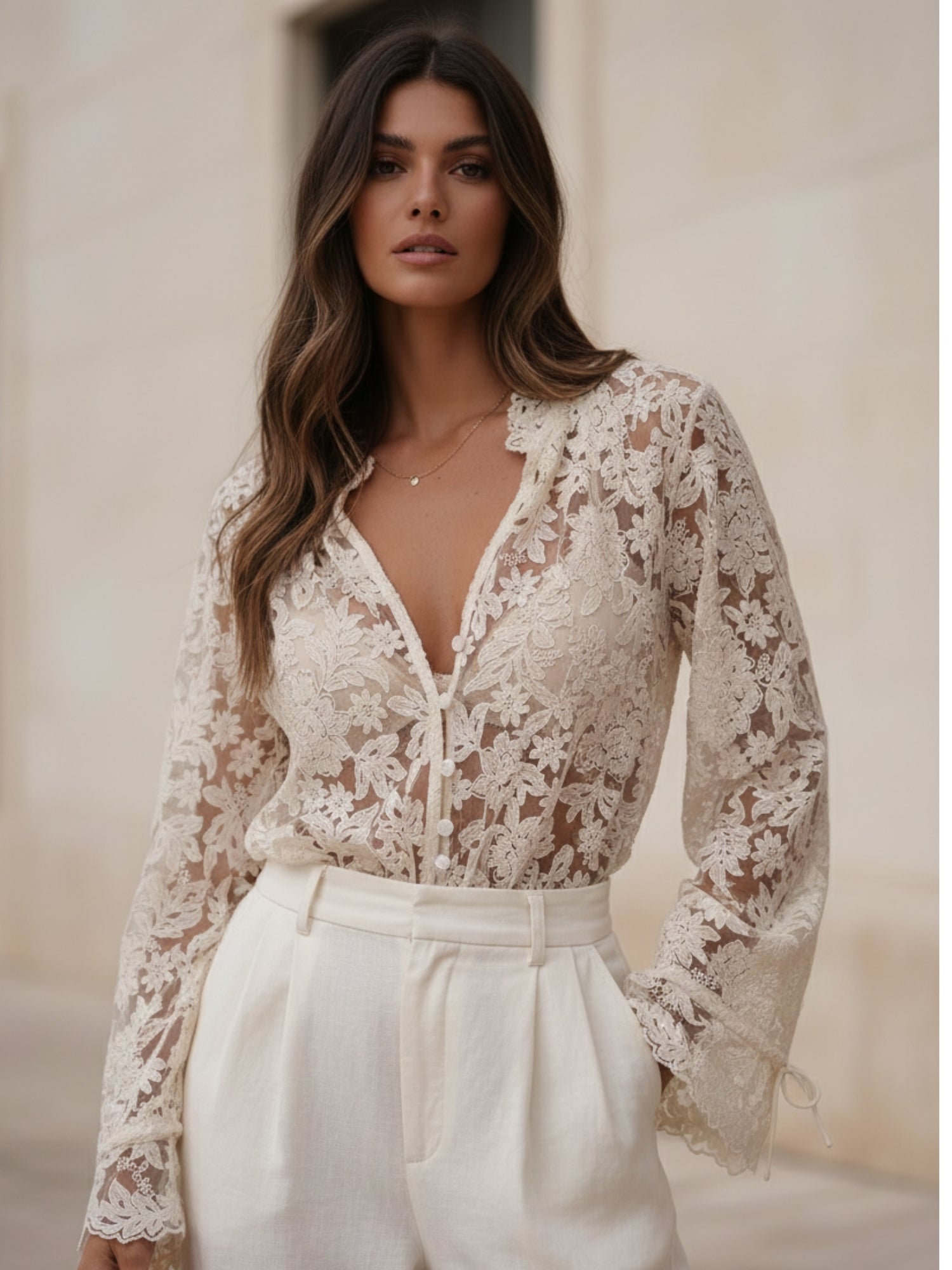 This cream bell-sleeve textured v-neck mesh top combines trendy mesh with classic elegance. The delicate bell sleeves and unique texture make it a lovely choice for dinner dates or an upscale brunch. A graceful and comfortable cream blouse perfect for attending theater nights and celebration events.