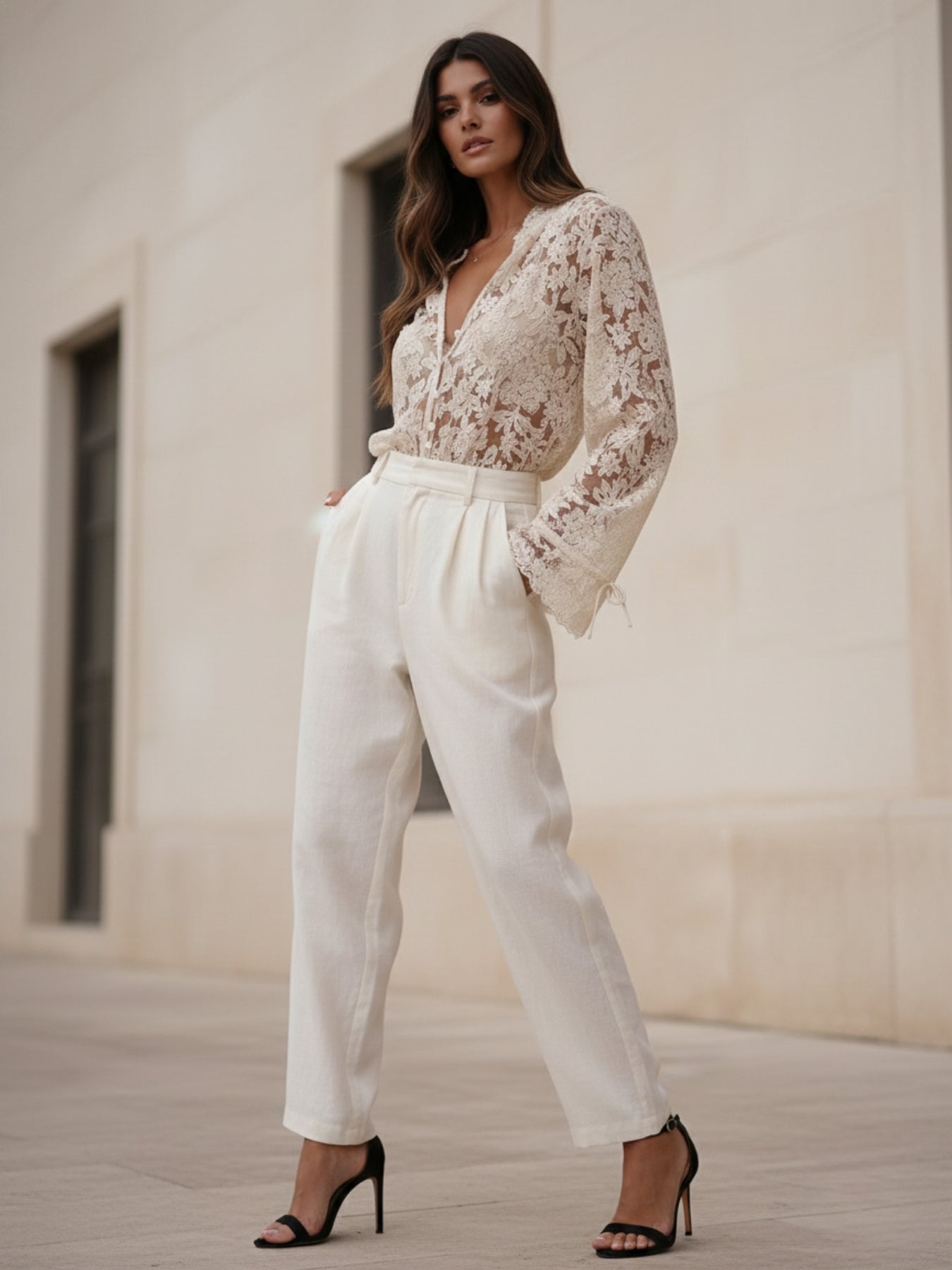 This cream bell-sleeve textured v-neck mesh top combines trendy mesh with classic elegance. The delicate bell sleeves and unique texture make it a lovely choice for dinner dates or an upscale brunch. A graceful and comfortable cream blouse perfect for attending theater nights and celebration events.