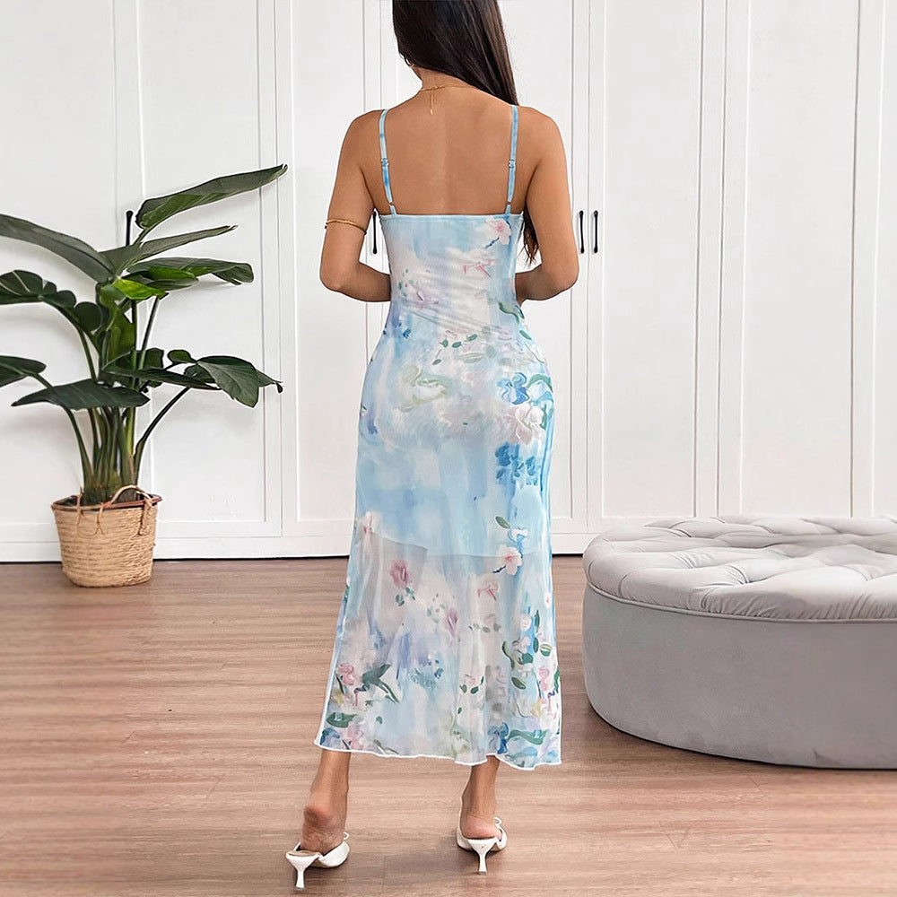 Pink Spaghetti Strap Floral Printed Bodycon Dress