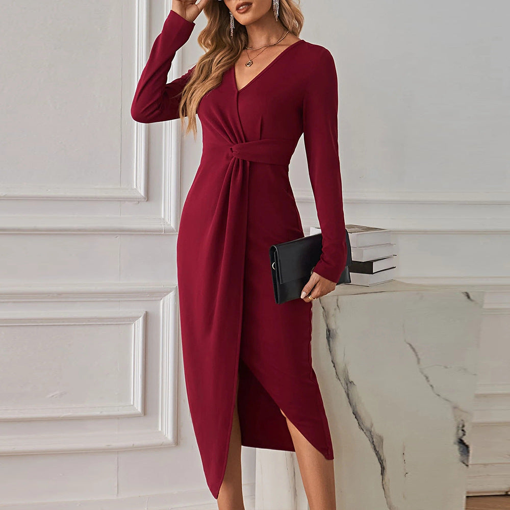 Wine Full Sleeve Cold Shoulder Front Ruched Dress