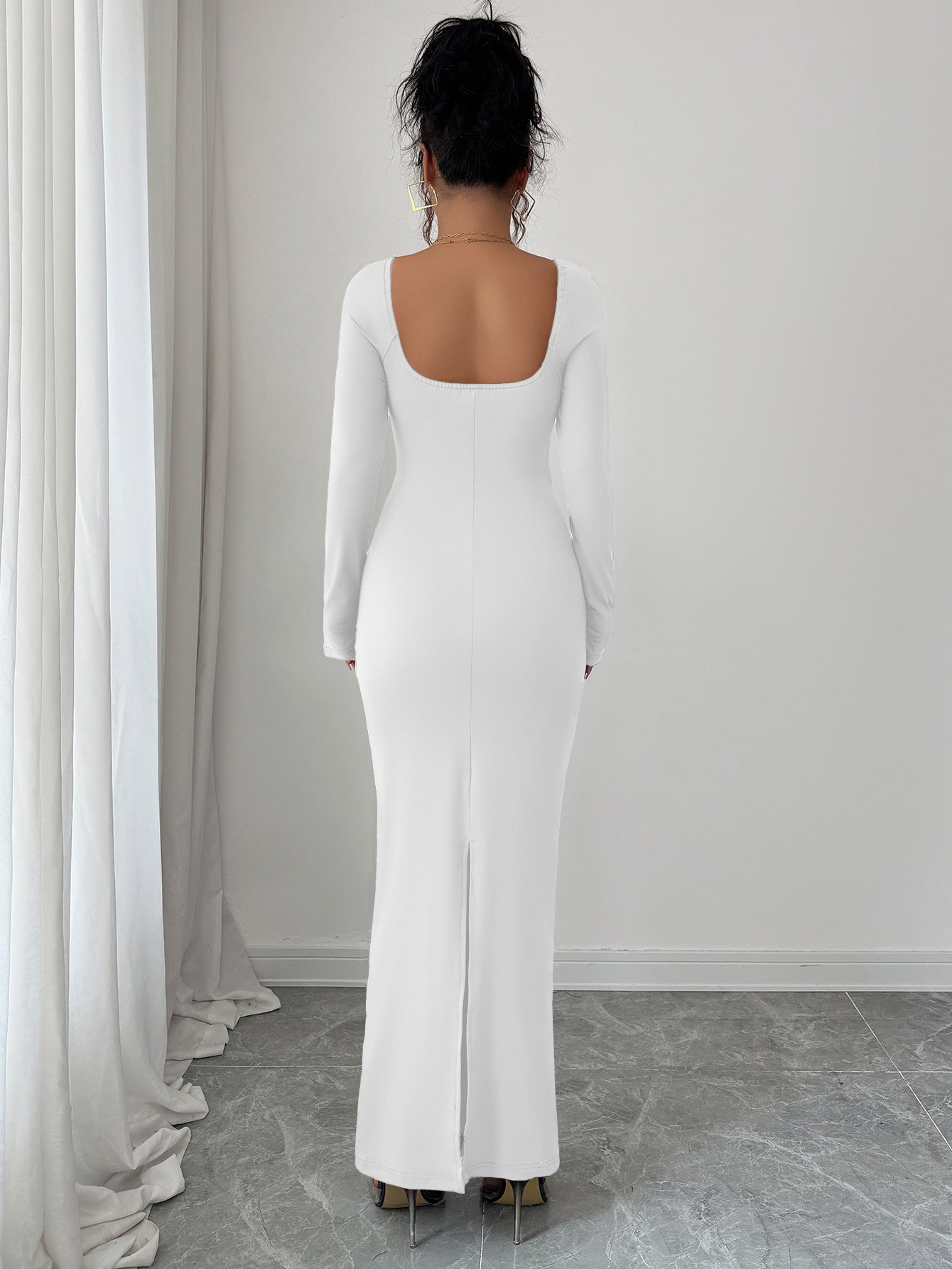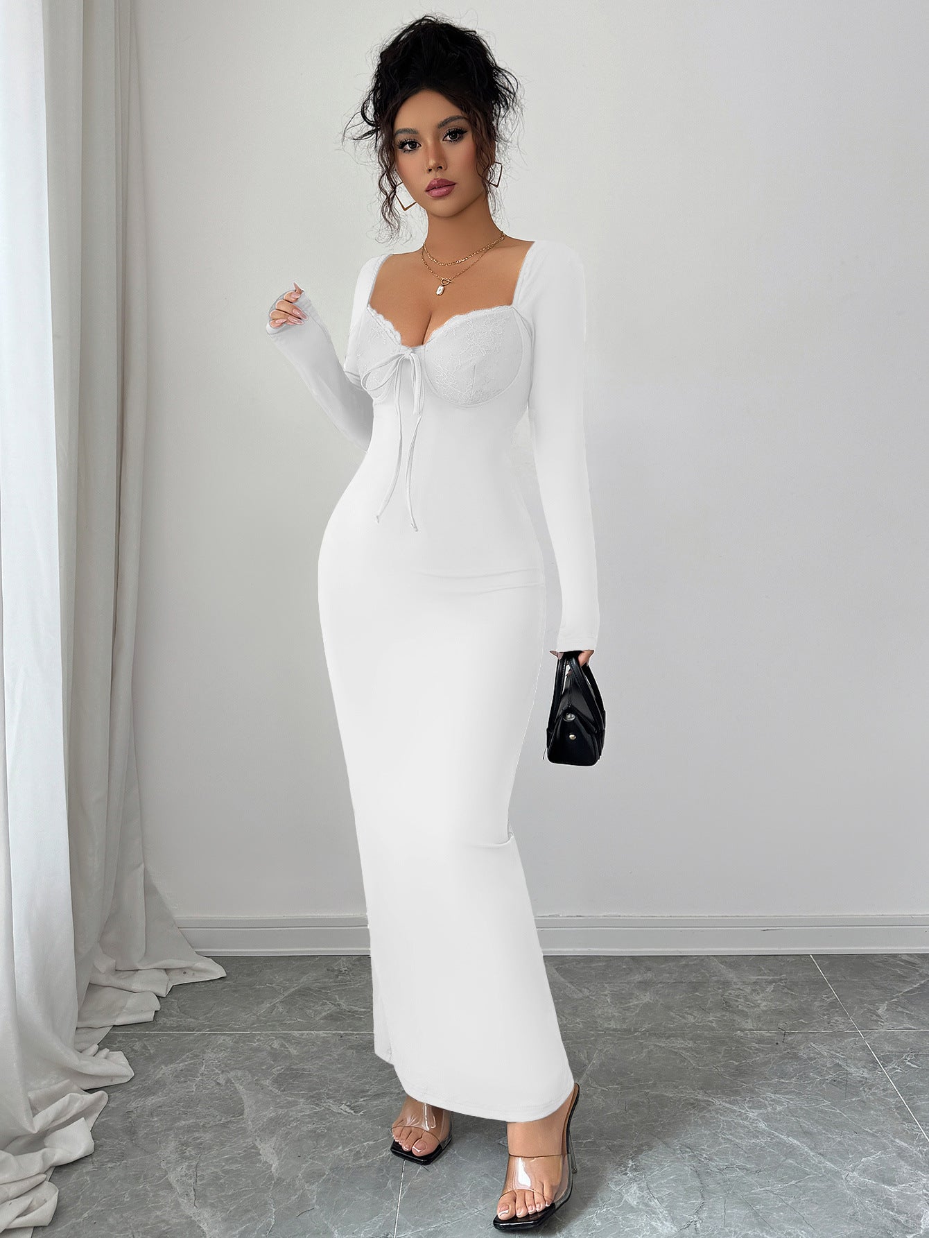White Full Sleeve Sweetheart Neck Fitted Dress
