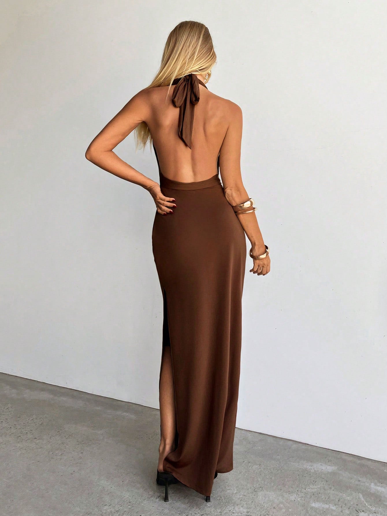 Burgundy Halter Neck Cut Out Dress With Side Slit