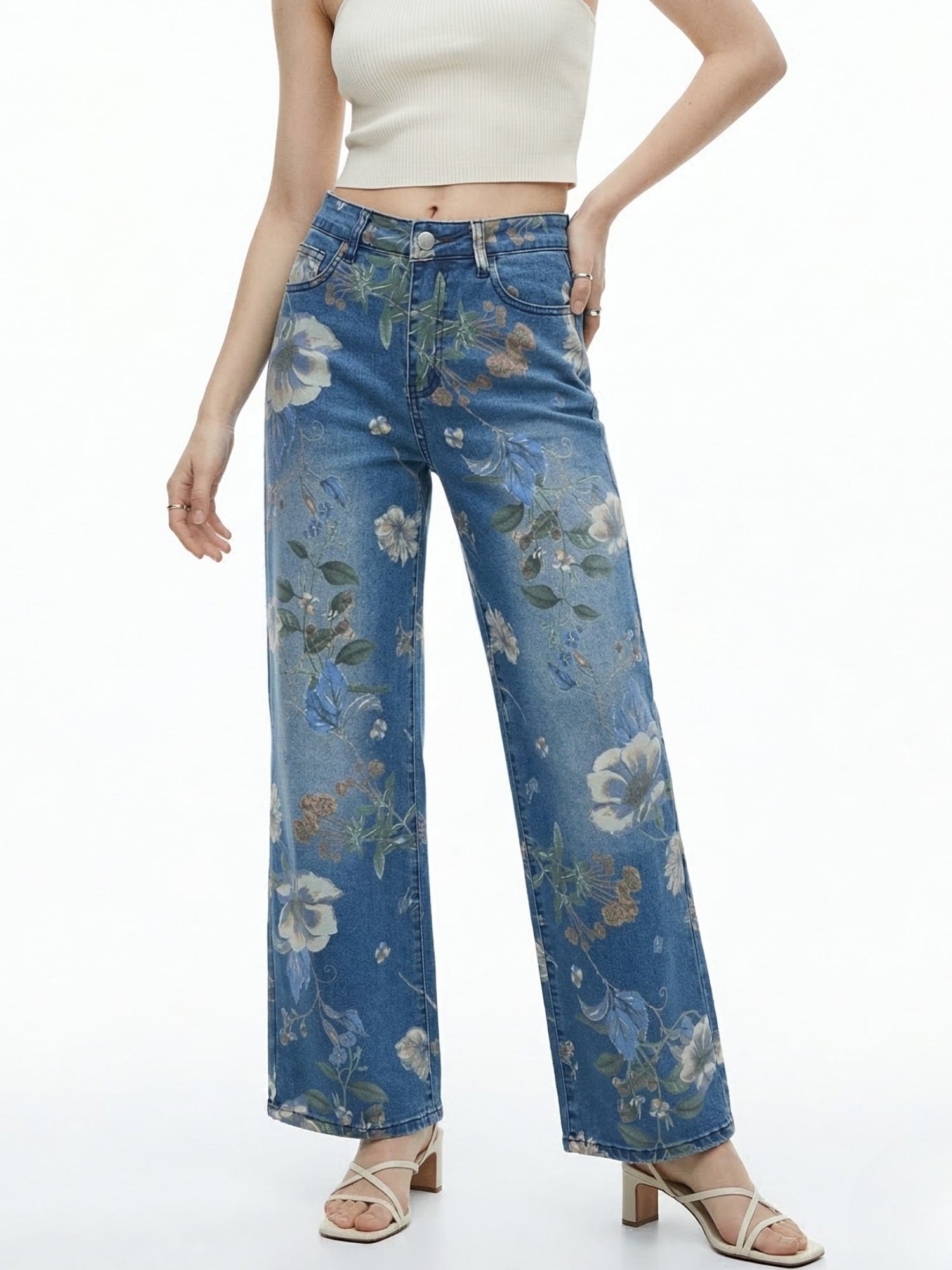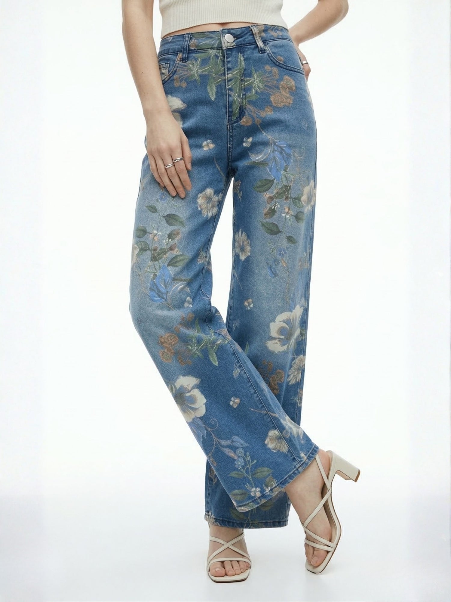 These stylish blue floral printed denim jeans are perfect for a garden party or a summer picnic. Their unique design makes them a standout choice for any weekend outing.