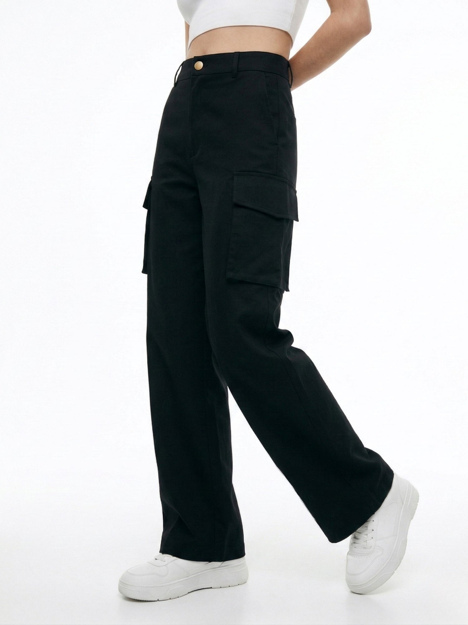 Stay trendy and professional in these black high-waist pants with a unique buttoned slit. These trousers are perfect for formal dinners or a day at the office. Complete the look with a fitted top and pointed heels for maximum impact.