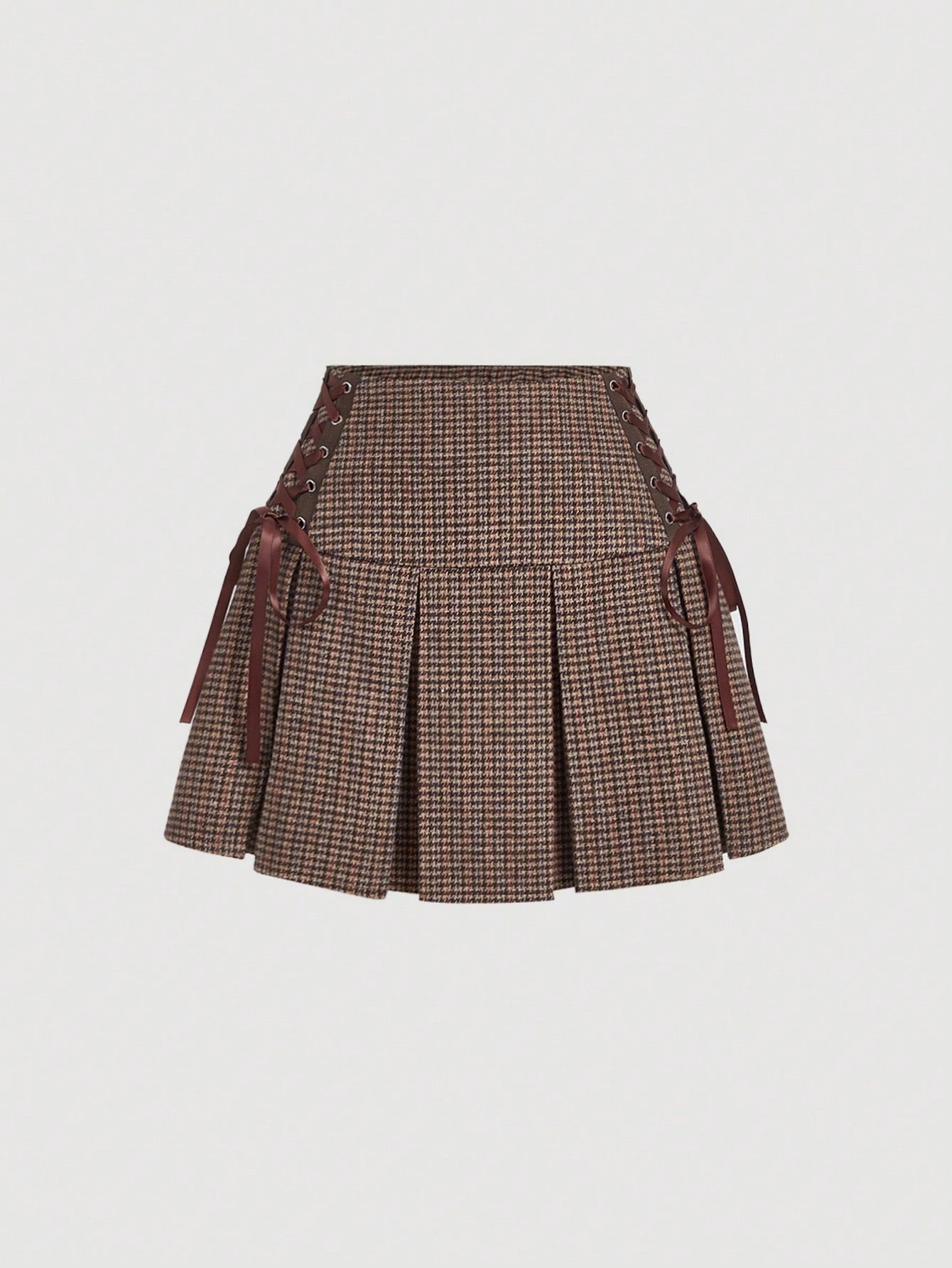 Burgundy Checkered Pleated Bow Detail Skirt