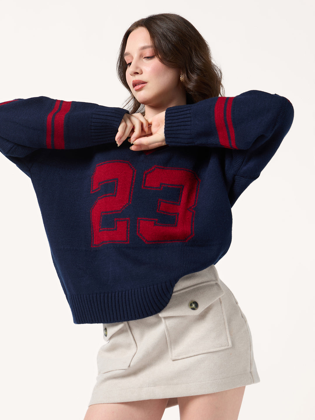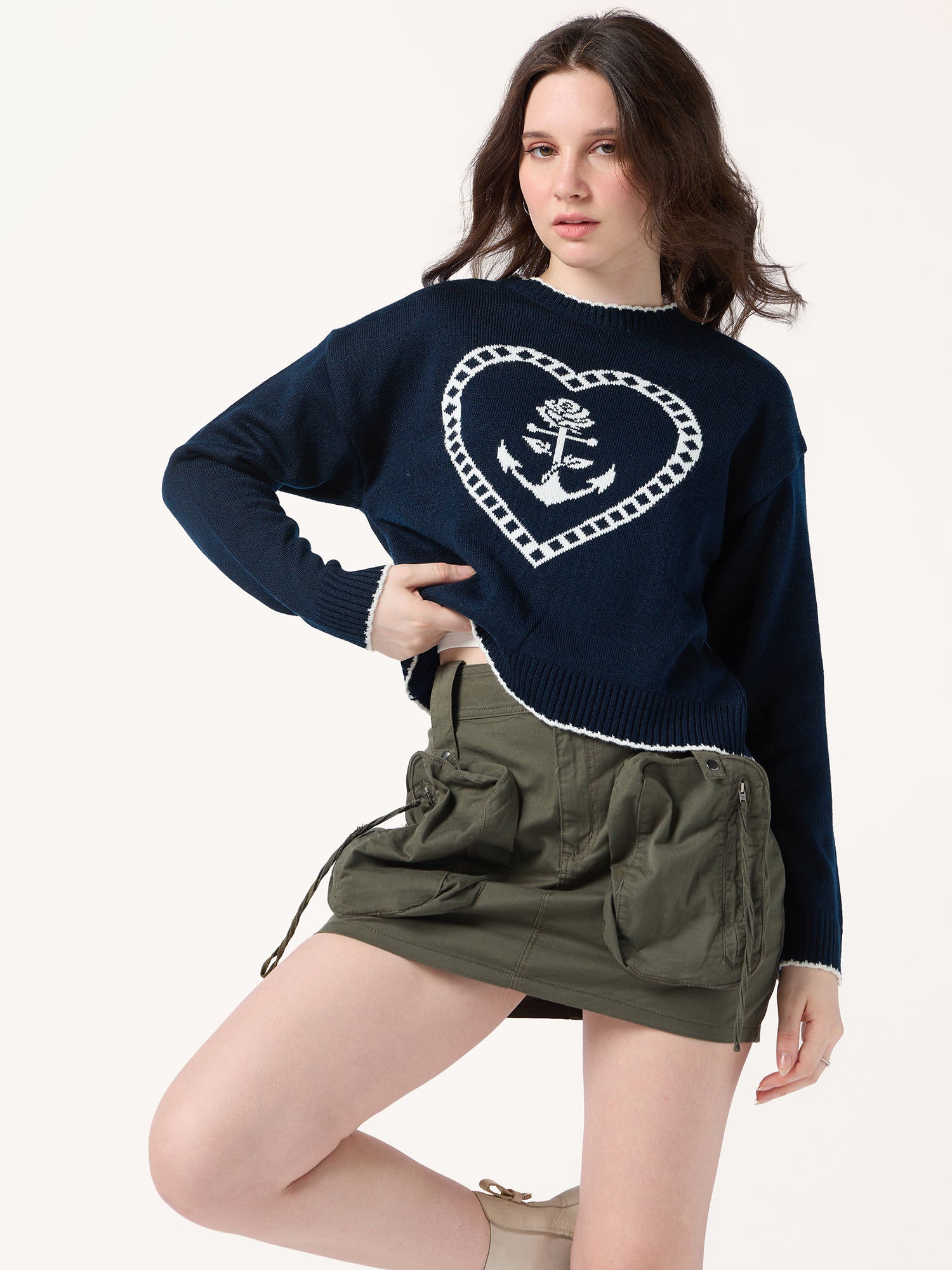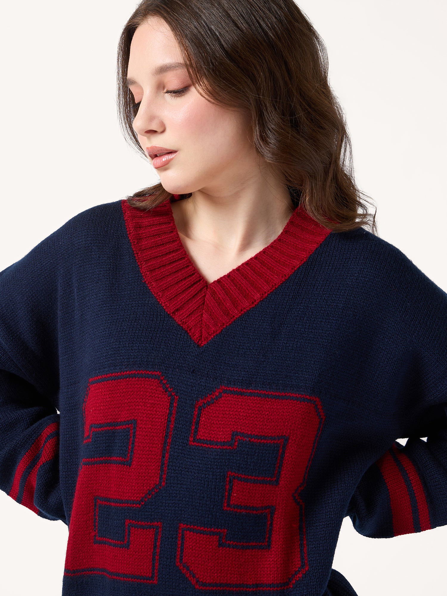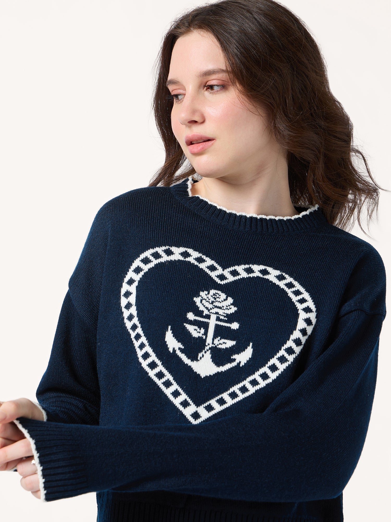 Navy Blue Contrast Stitch Hem And Neck With Graphic Sweater