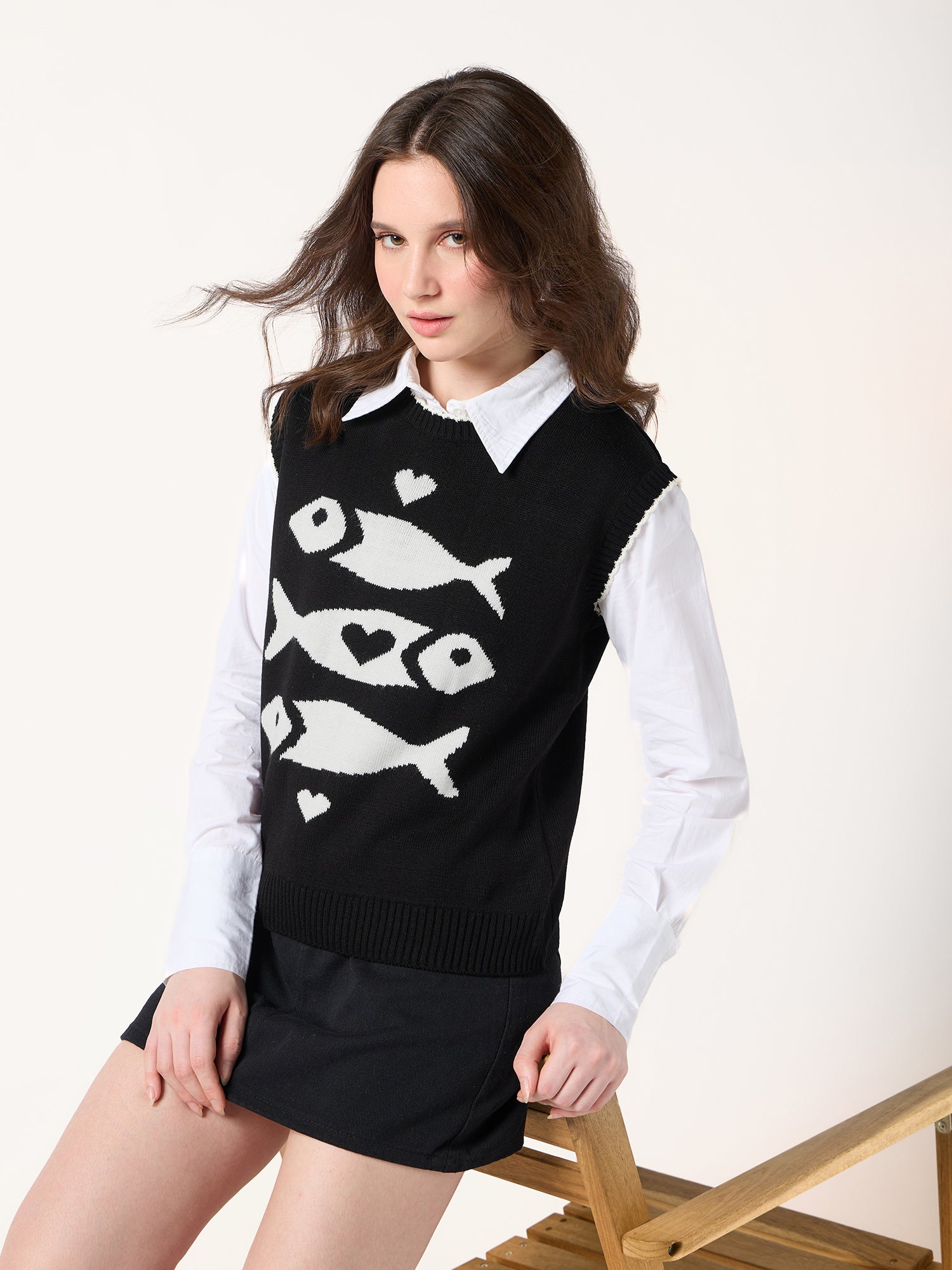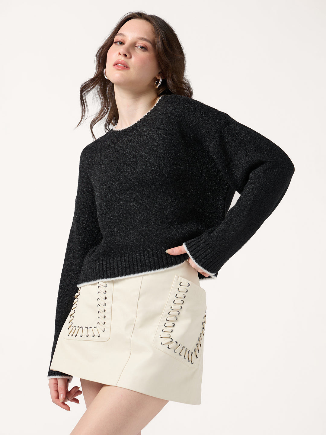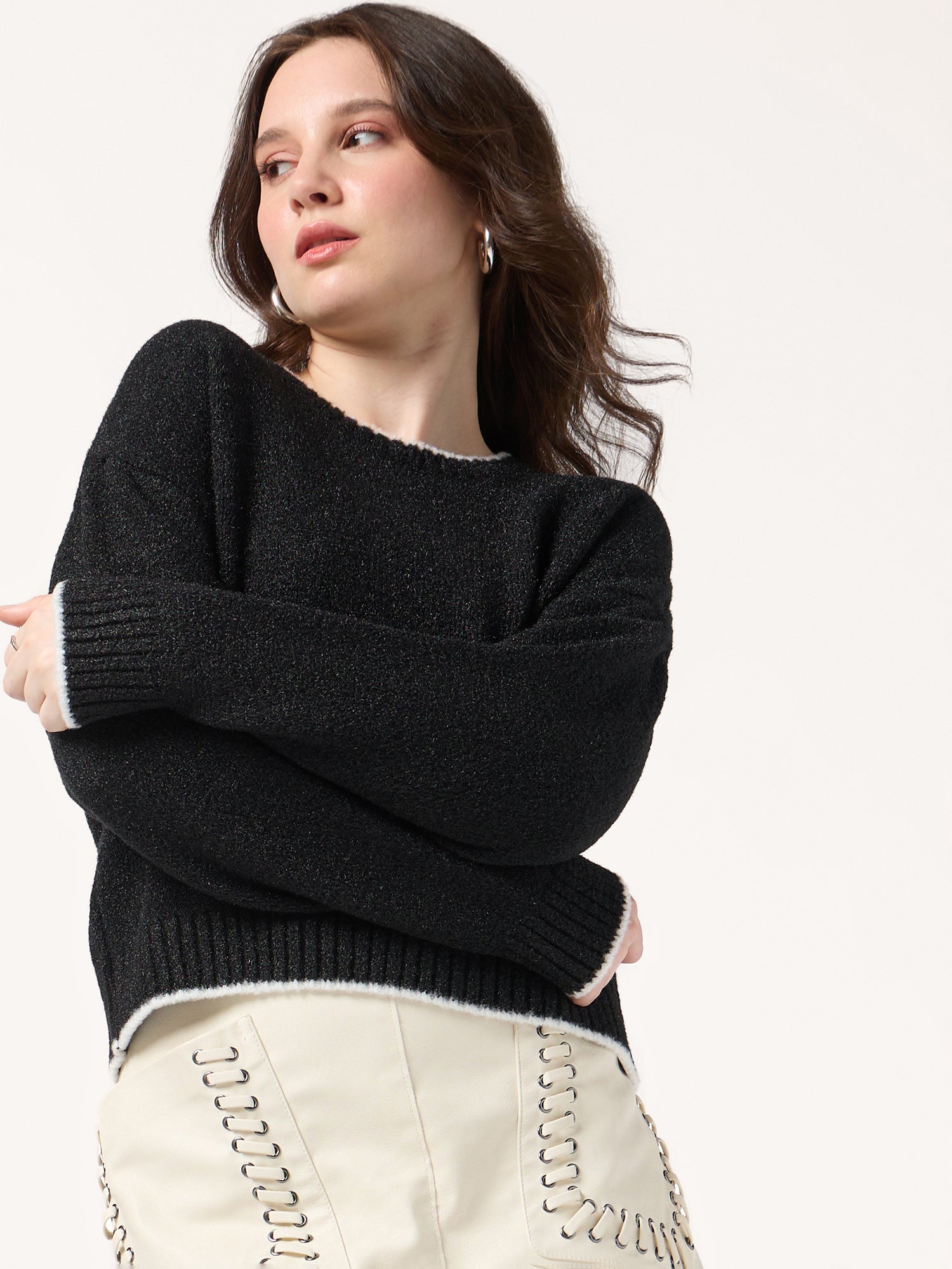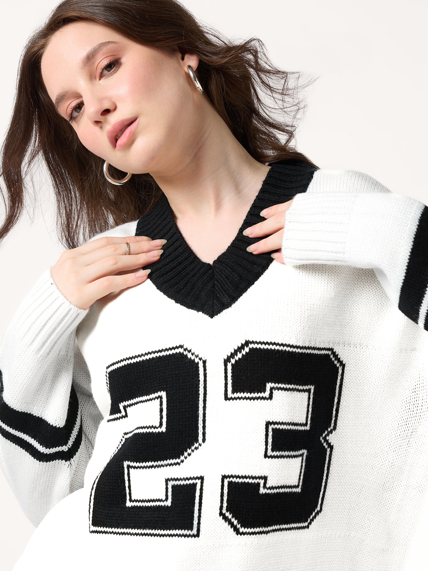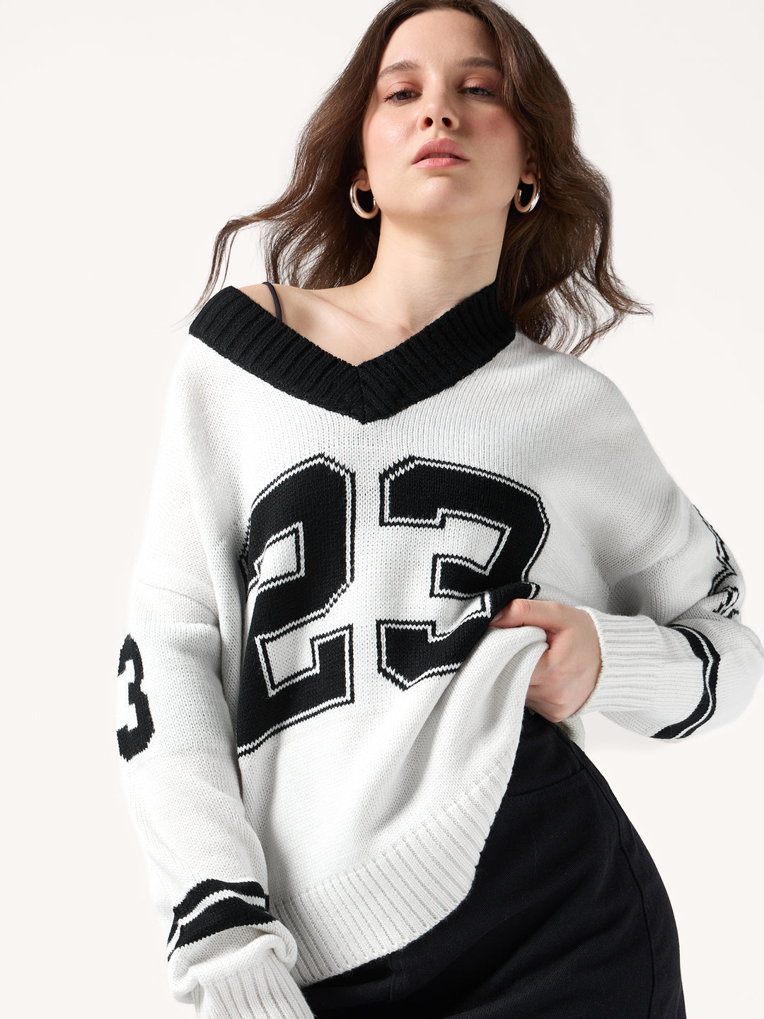 Navy Blue Contrast Stitch Hem And Neck With Graphic Sweater