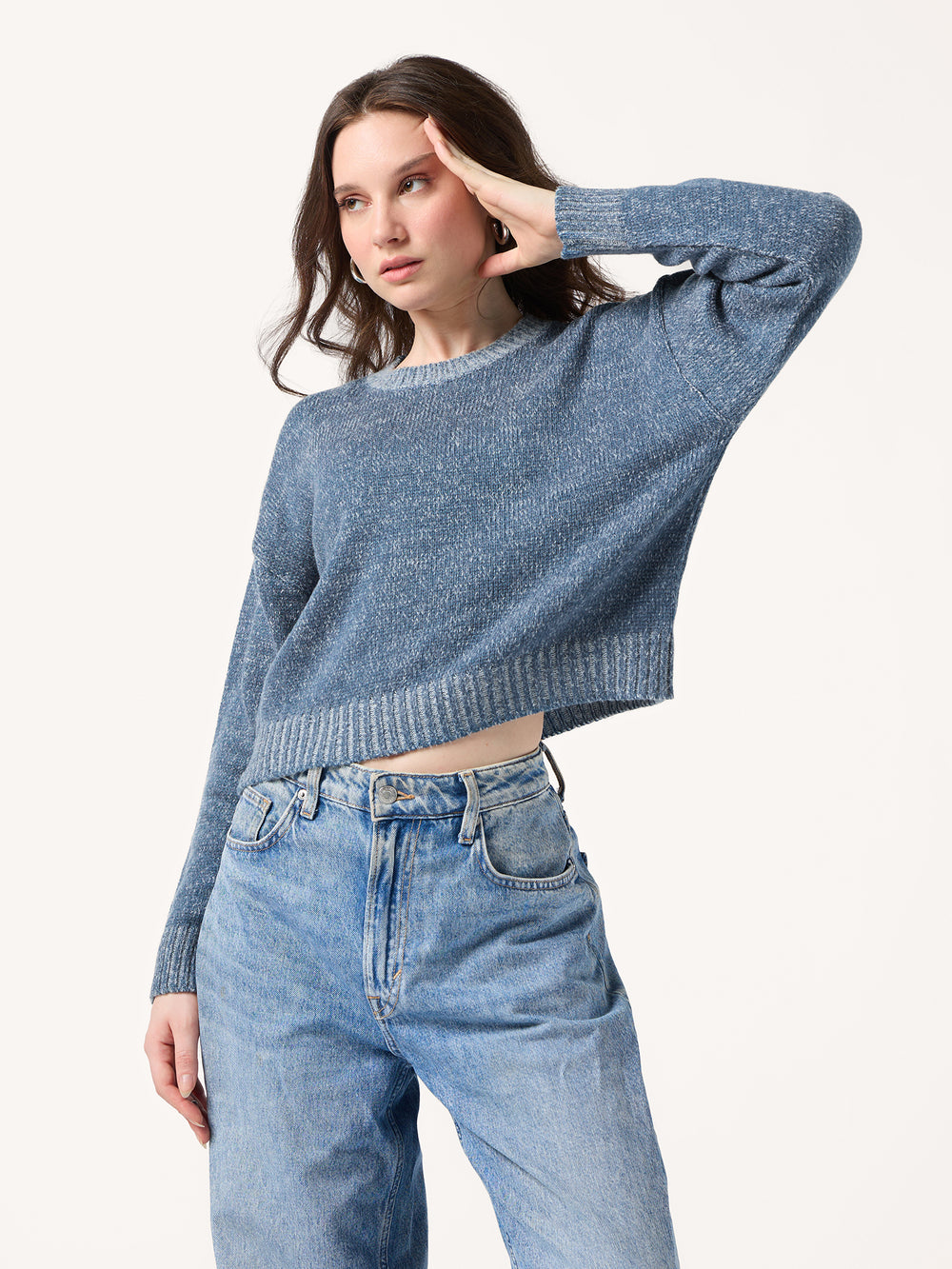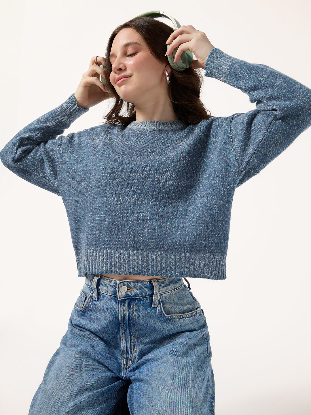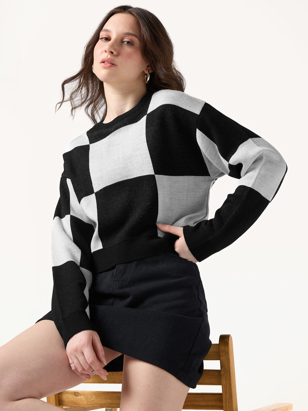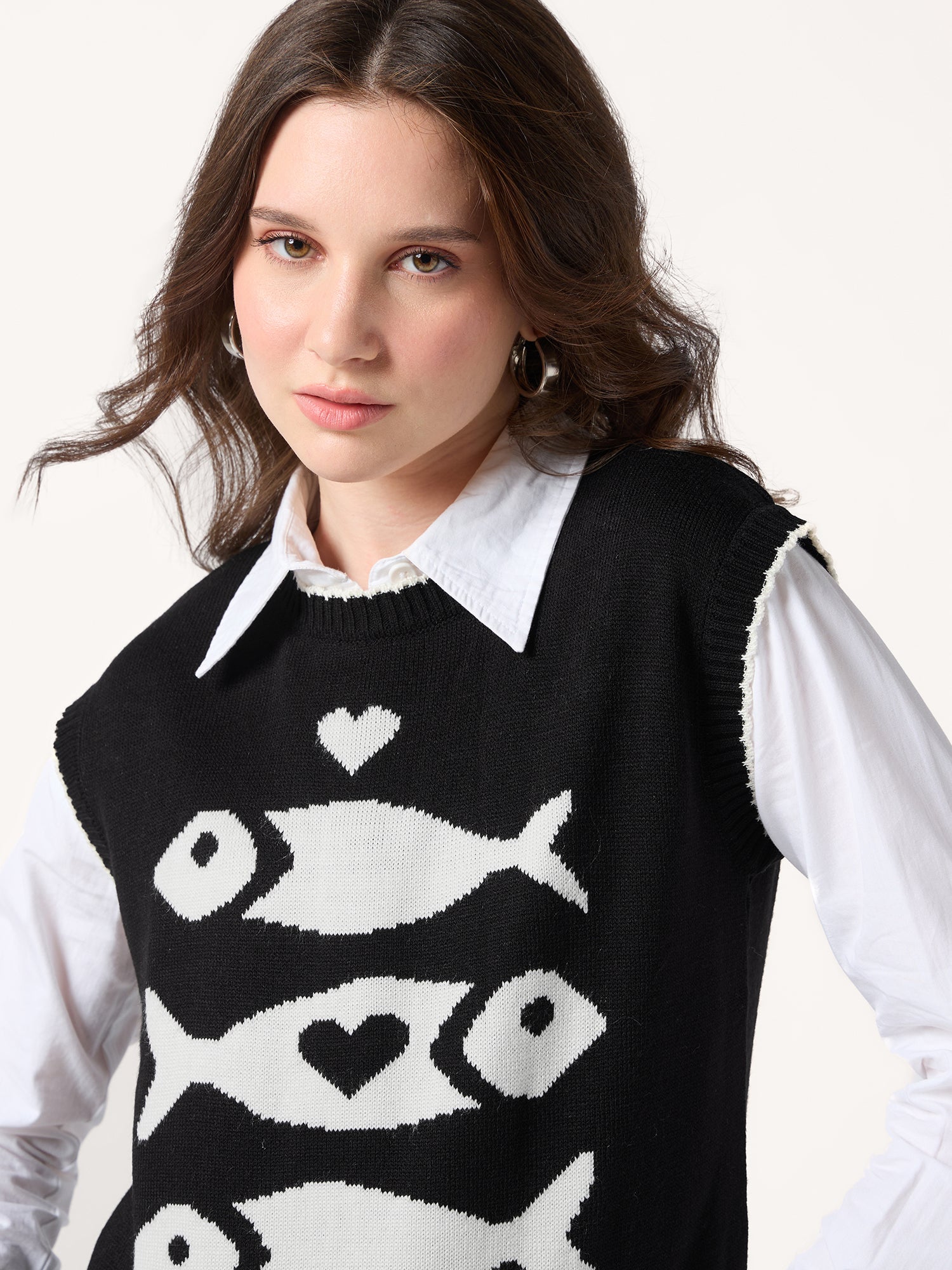 Navy Blue Contrast Stitch Hem And Neck With Graphic Sweater