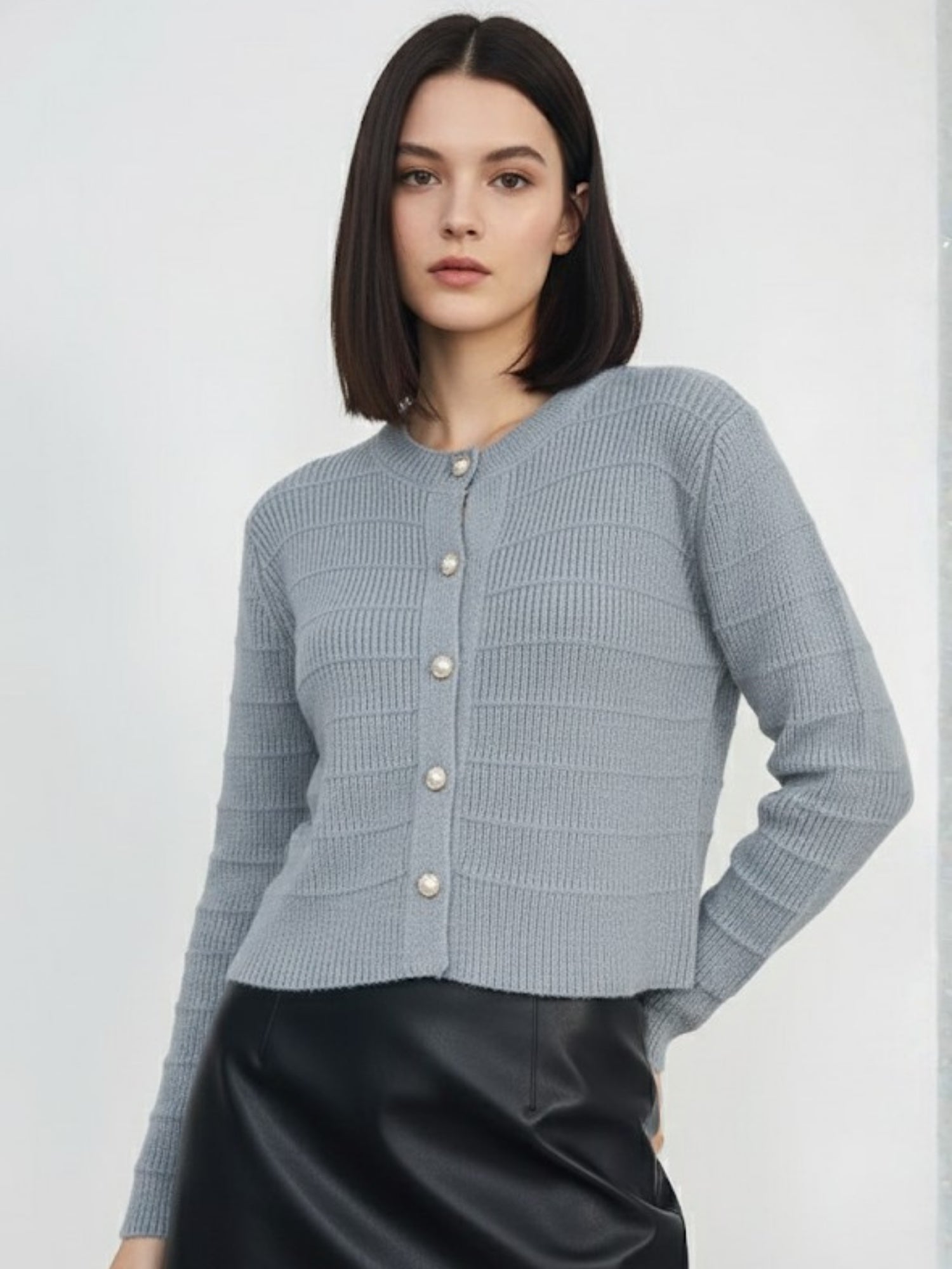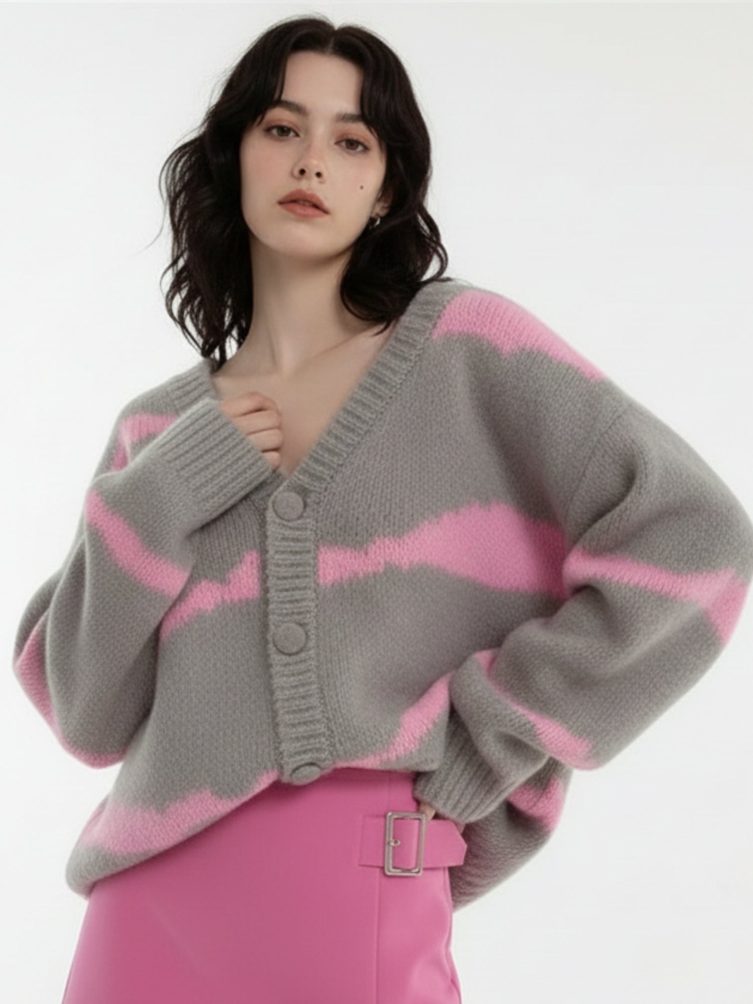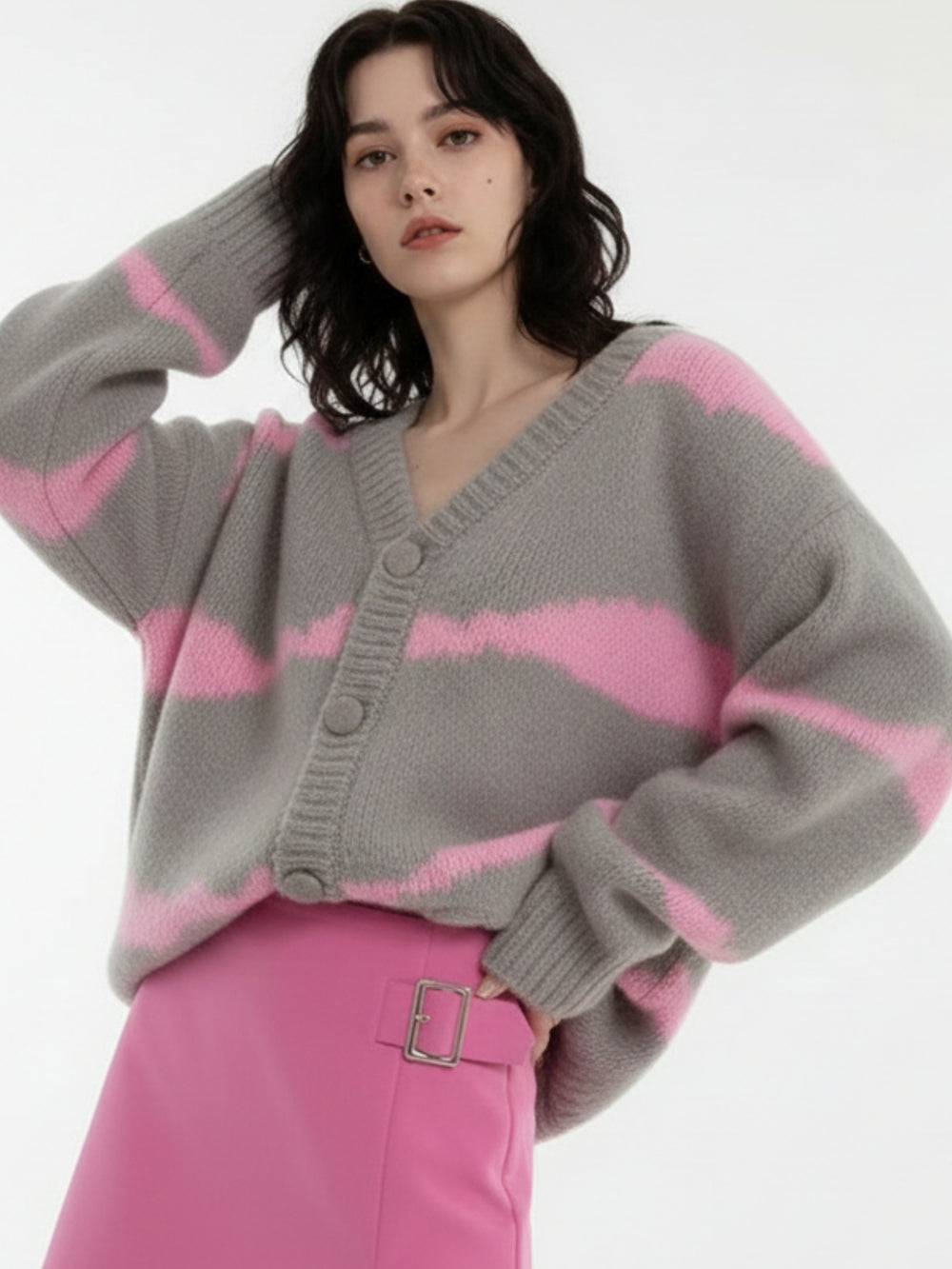 Grey Front Buttoned Slouchy Cardigan is designed with a oversized fit and a stripes pattern and a longline length for a flattering silhouette. Perfect for winterwear layering, partywear nights, or polished officewear looks, this piece transitions effortlessly from day to after-hours styling. Style it with tailored bottoms or statement layers for an on-trend, Gen-Z approved outfit that feels current, versatile, and easy to wear across seasons.