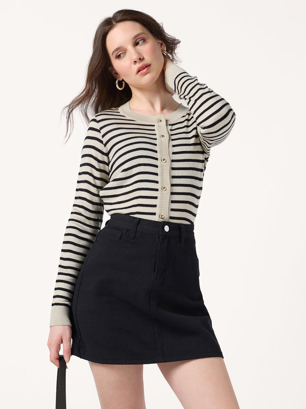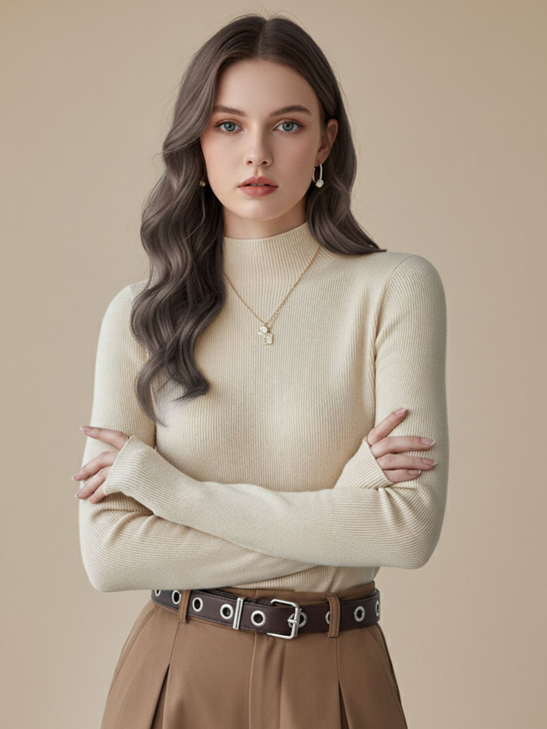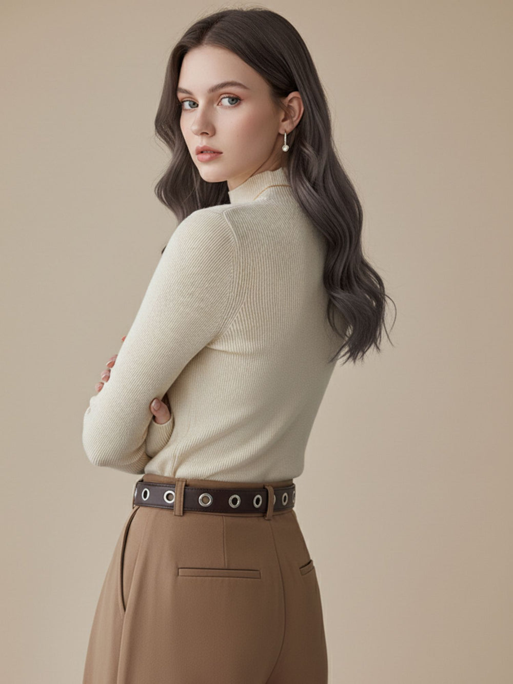 Off White Full Sleeve Mock Neck Fitted Sweater