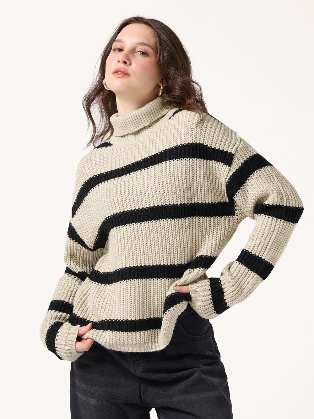 Cream Full Sleeve Mock Neck Fitted Sweater