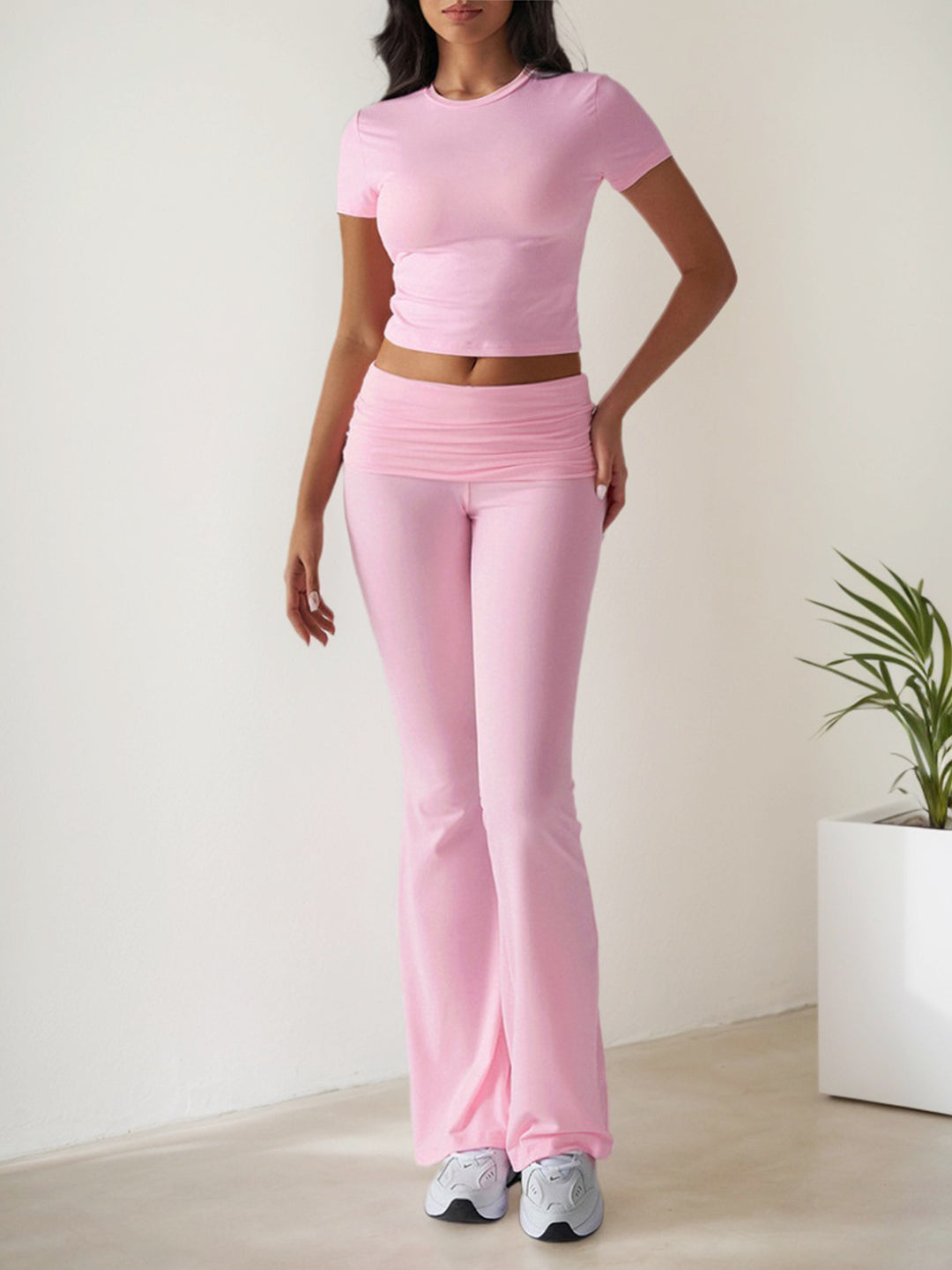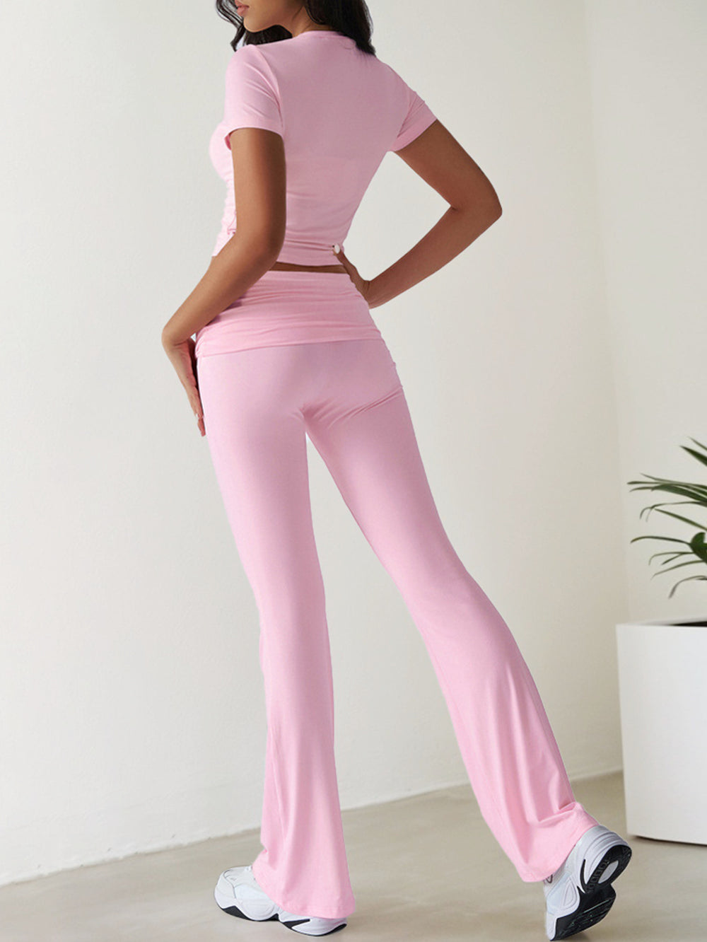 Pink Short Sleeve Top & Waist Ruched Pant Set