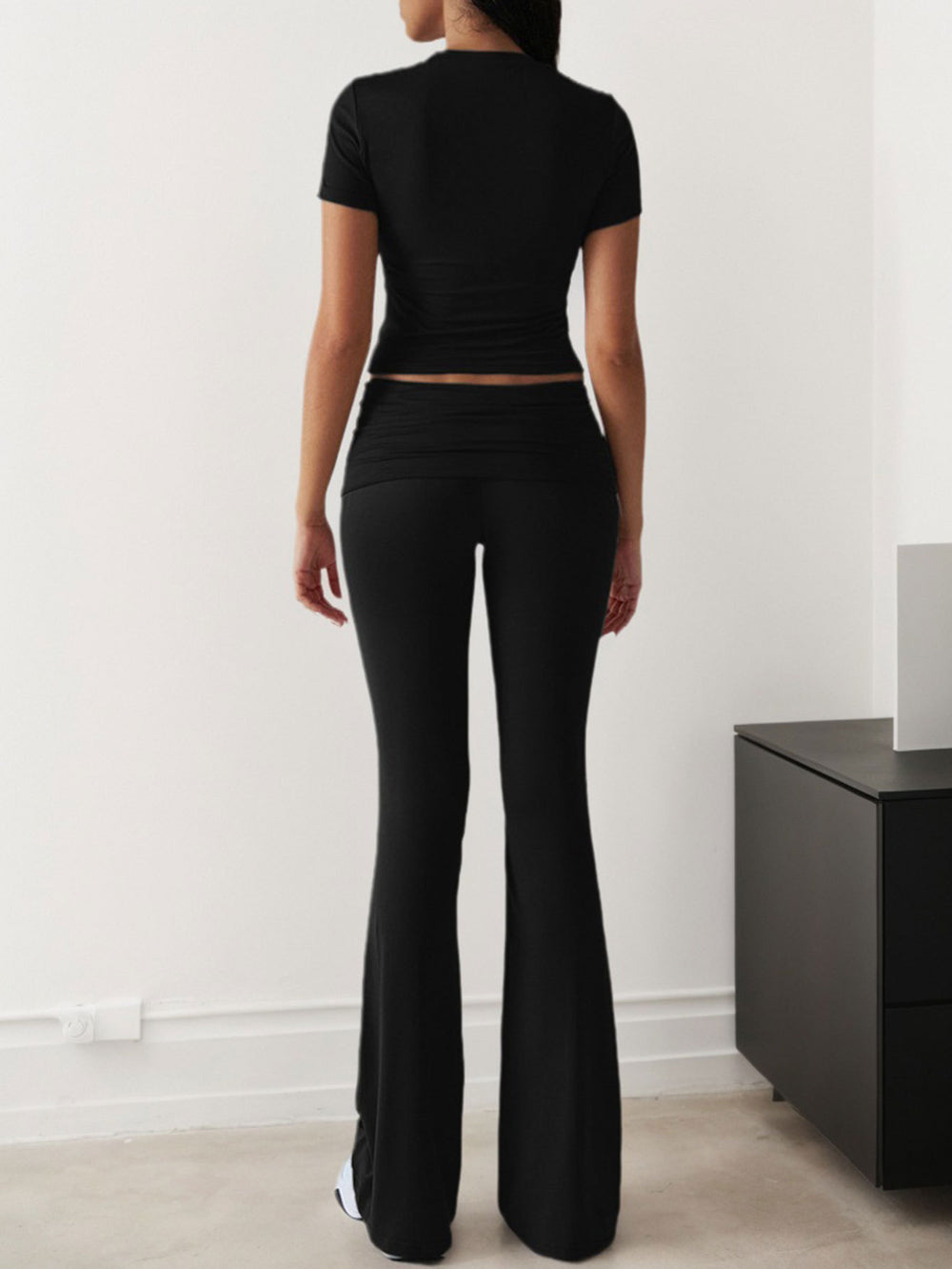 Black Short Sleeve Top & Waist Ruched Pant Set