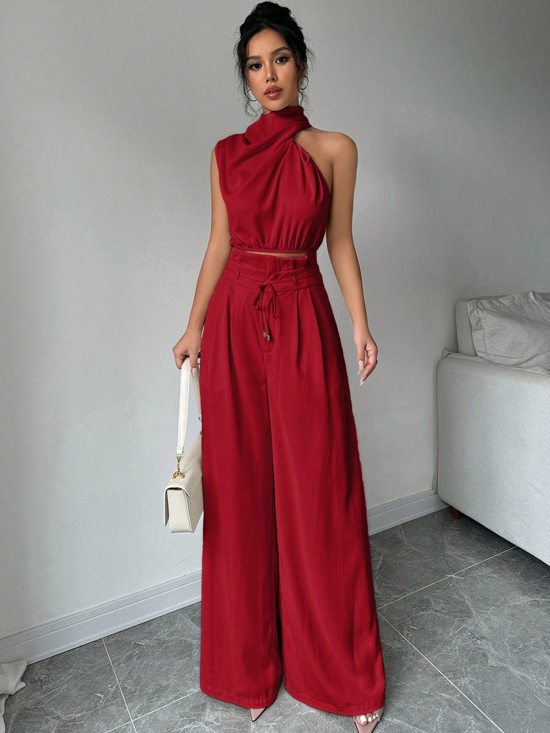 Red Asymmetrical High Neck Top with Wide Straight Pant Co-Ord Set