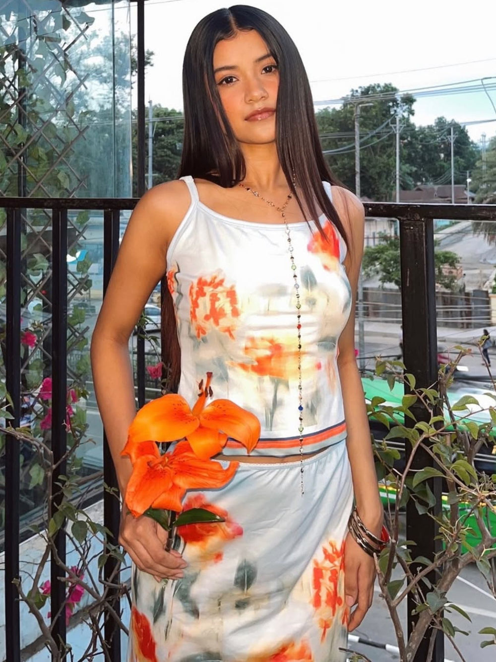 Orange Sleeveless Printed Top And Skirt Co-Ord Set