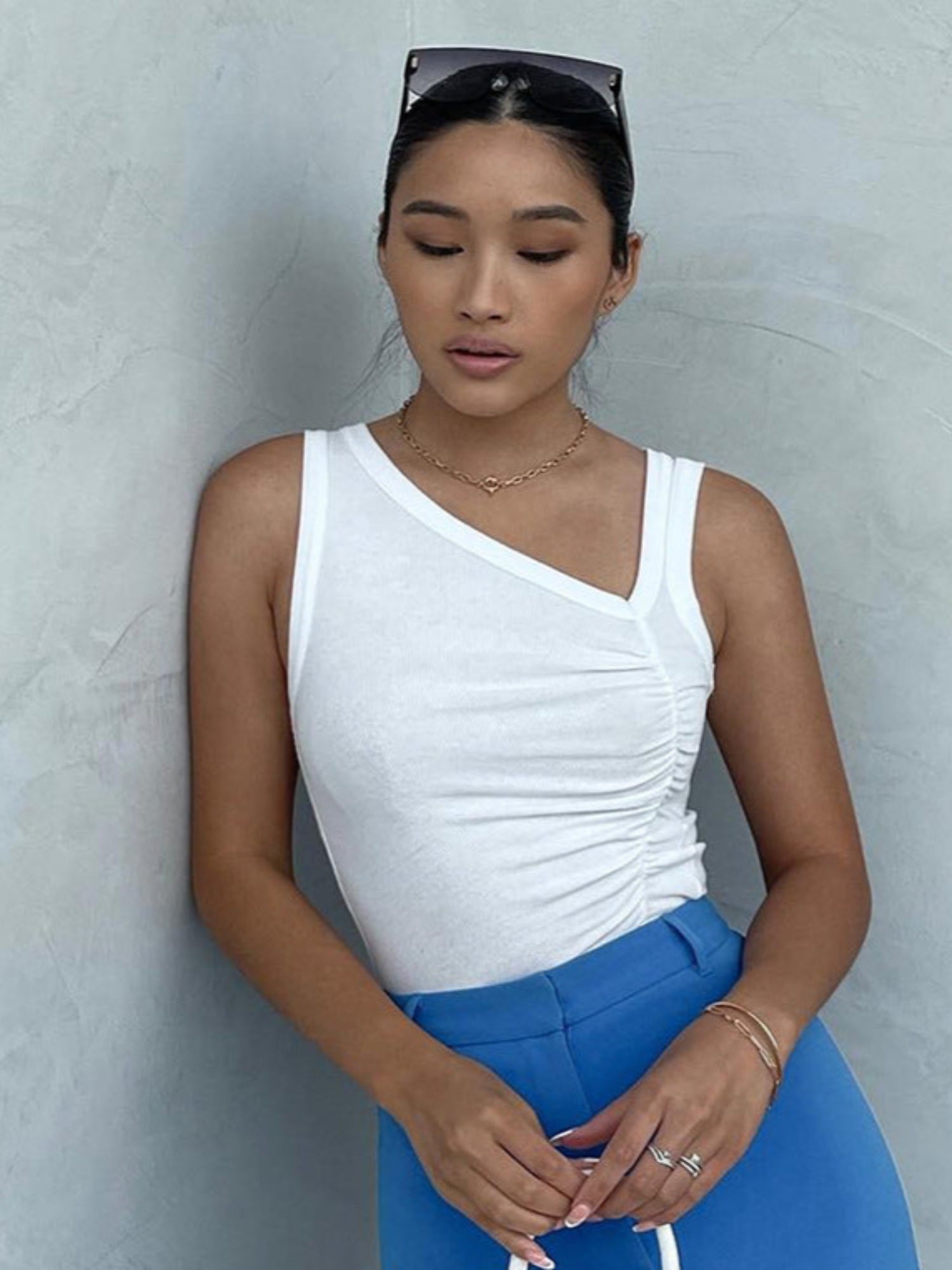 Upgrade your vacation wardrobe with our White Assymetric Neck Tank. Made for the stylish traveler, this knit top effortlessly transitions from day to night. Perfect for parties and any hero style moment, this tank is a must-have addition to your topwear collection.
