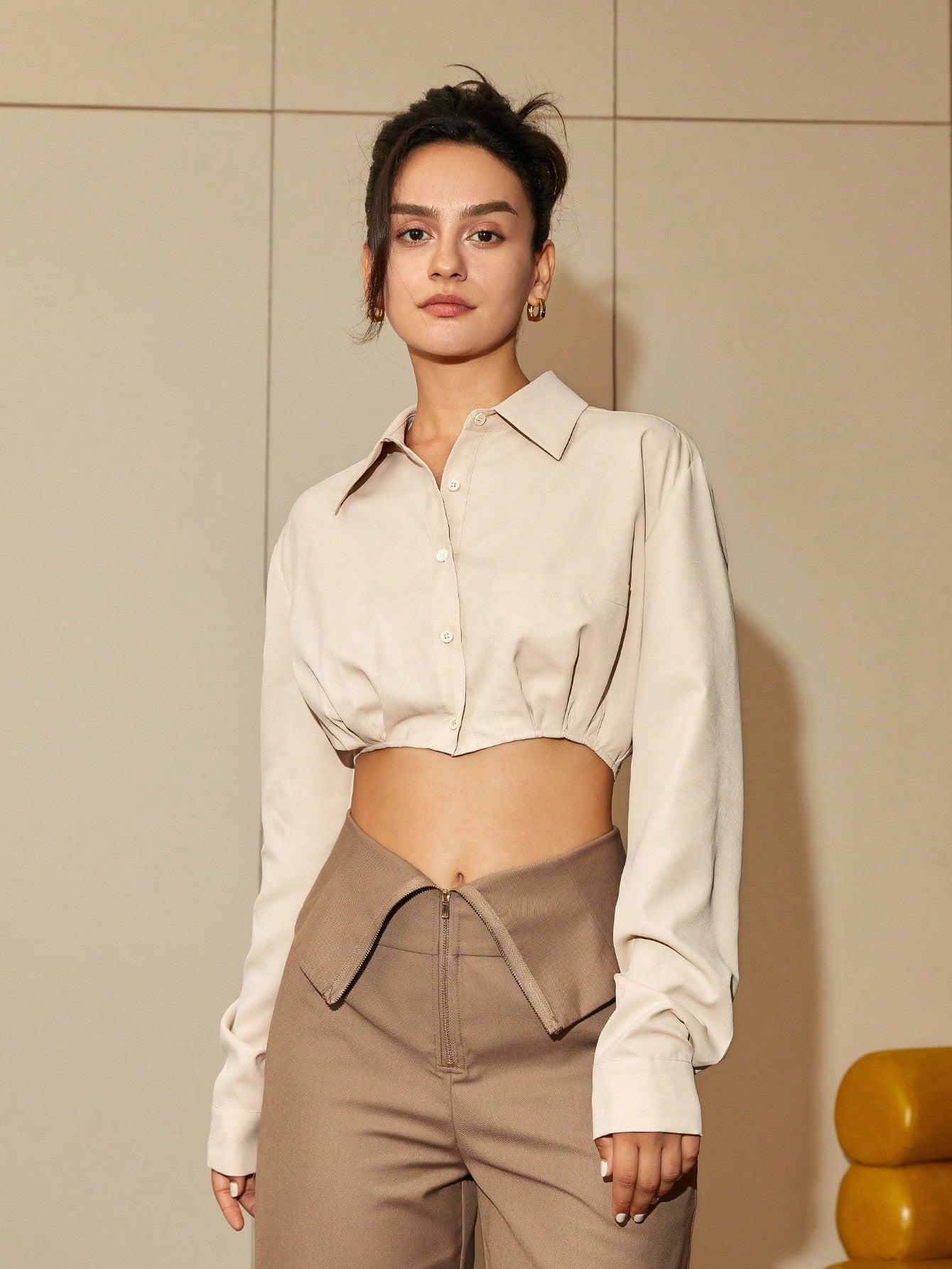 Looking for a Cropped Shirt? Your search ends here. Check out our new arrivals in beige casual wear, perfect for street style. Whether it锟斤拷锟絪 streetwear or casual wear, this top is made from comfortable polyester and designed to add a chic touch to your wardrobe.