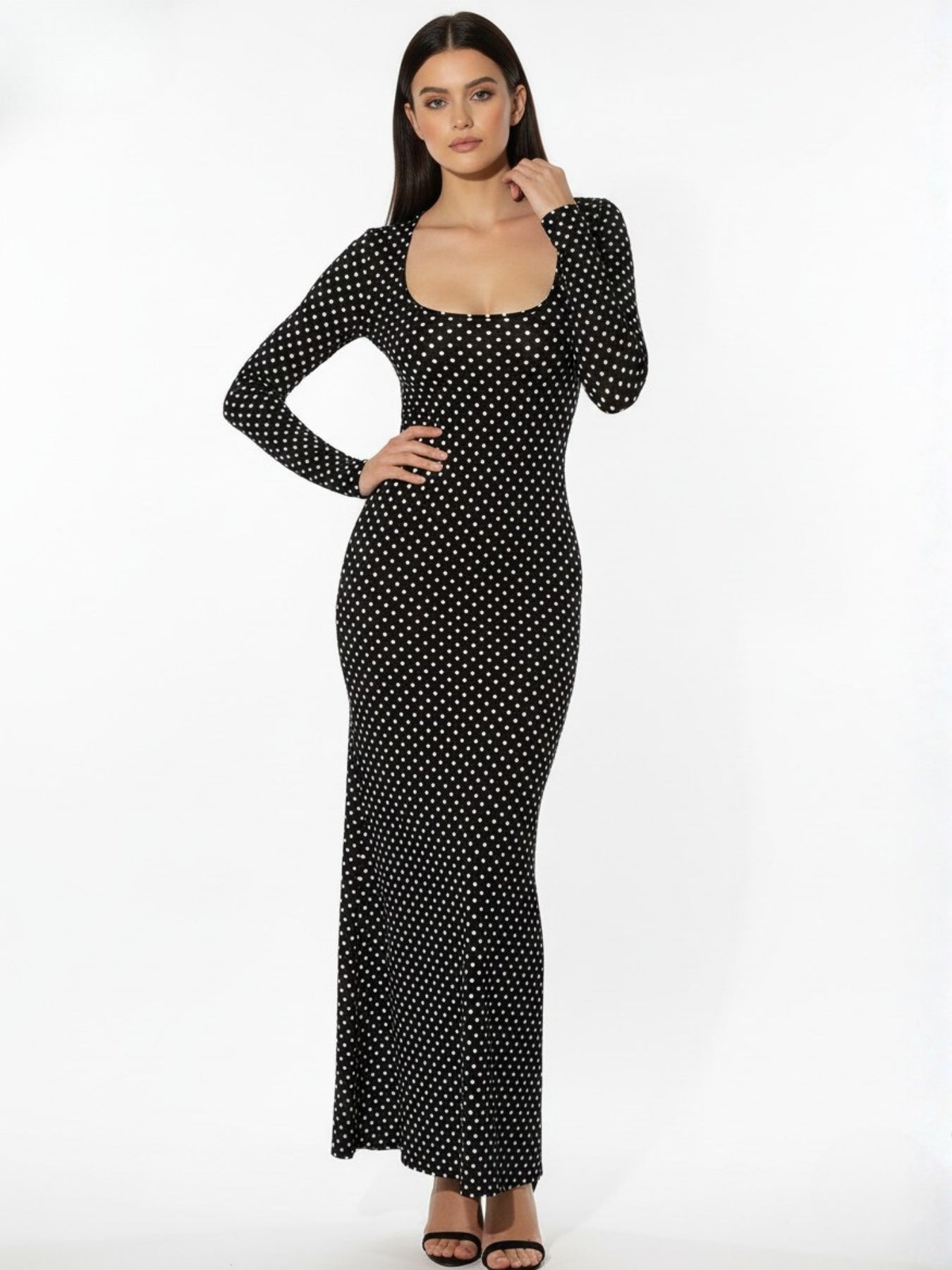 Add a touch of retro sophistication to your daily style with this black scoop neck polka dot dress. The timeless print and flattering silhouette make it a versatile piece for office wear or a casual weekend lunch with friends. Pair it with classic pumps or flats for a polished, feminine appearance.
