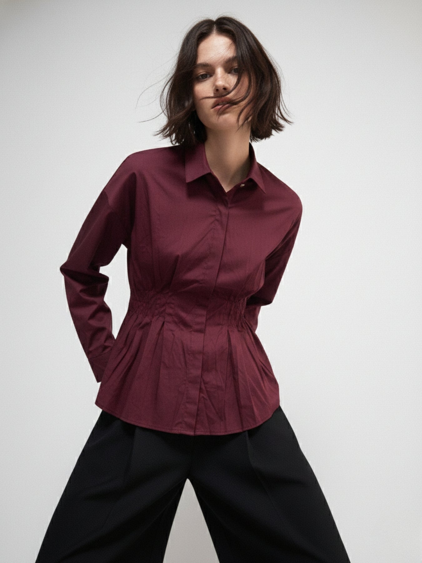 Burgundy Front Pleated Waist Fitted Shirt