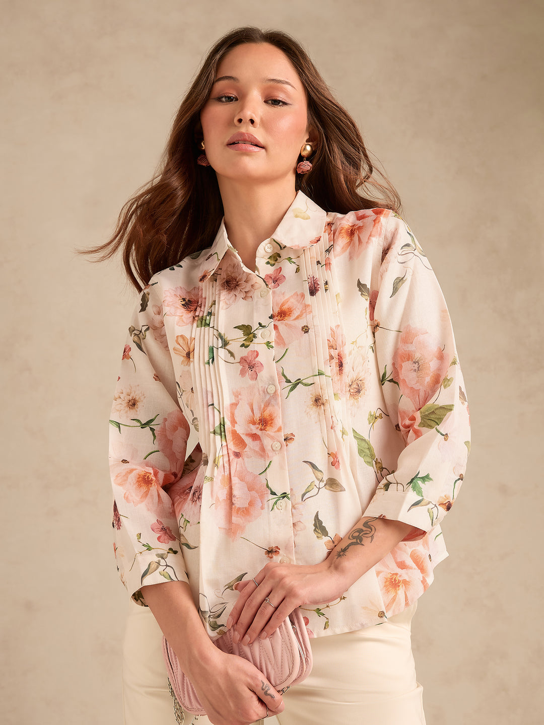 Off-White Regular Fit Printed Shirt with Pintuck Details