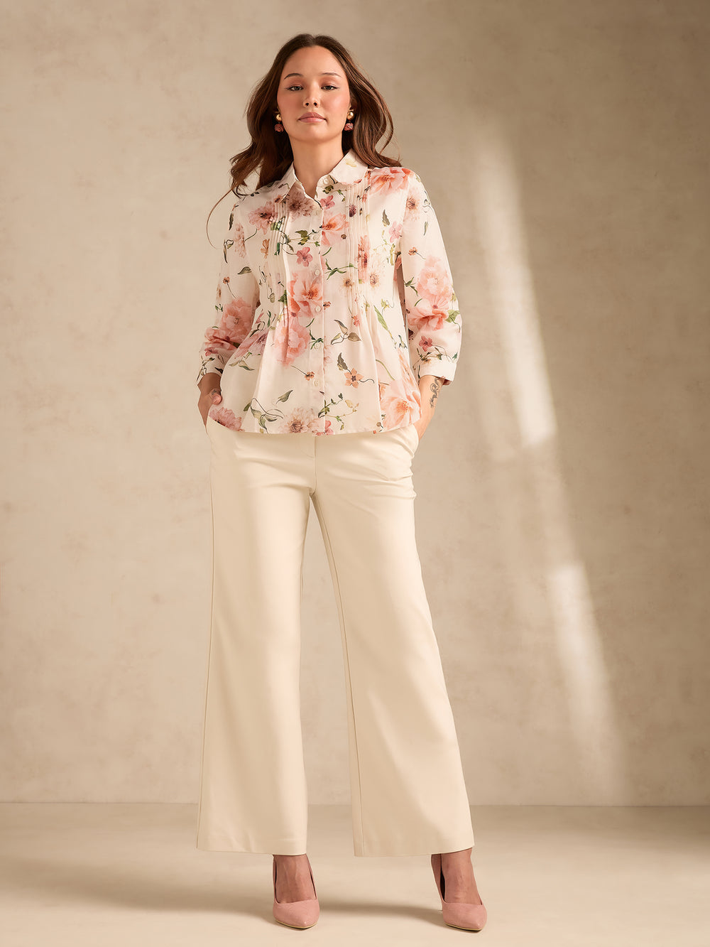 Elevate your wardrobe with this off-white regular fit shirt. The delicate pintuck details and subtle print offer a sophisticated touch suitable for office wear or daytime meetings. Its versatile design makes it ideal for a casual brunch or family gatherings when paired with tailored trousers or denim.