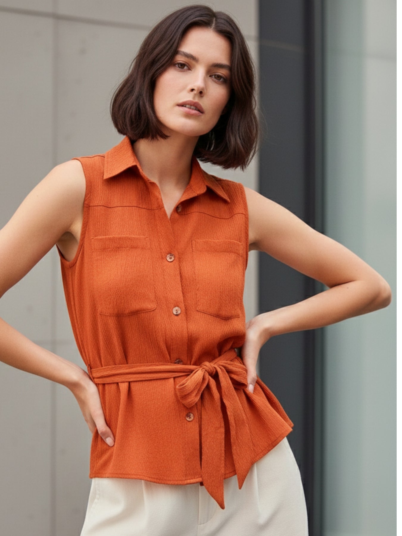 Rust Sleeveless Shirt With Pocket And Tie Up Detail