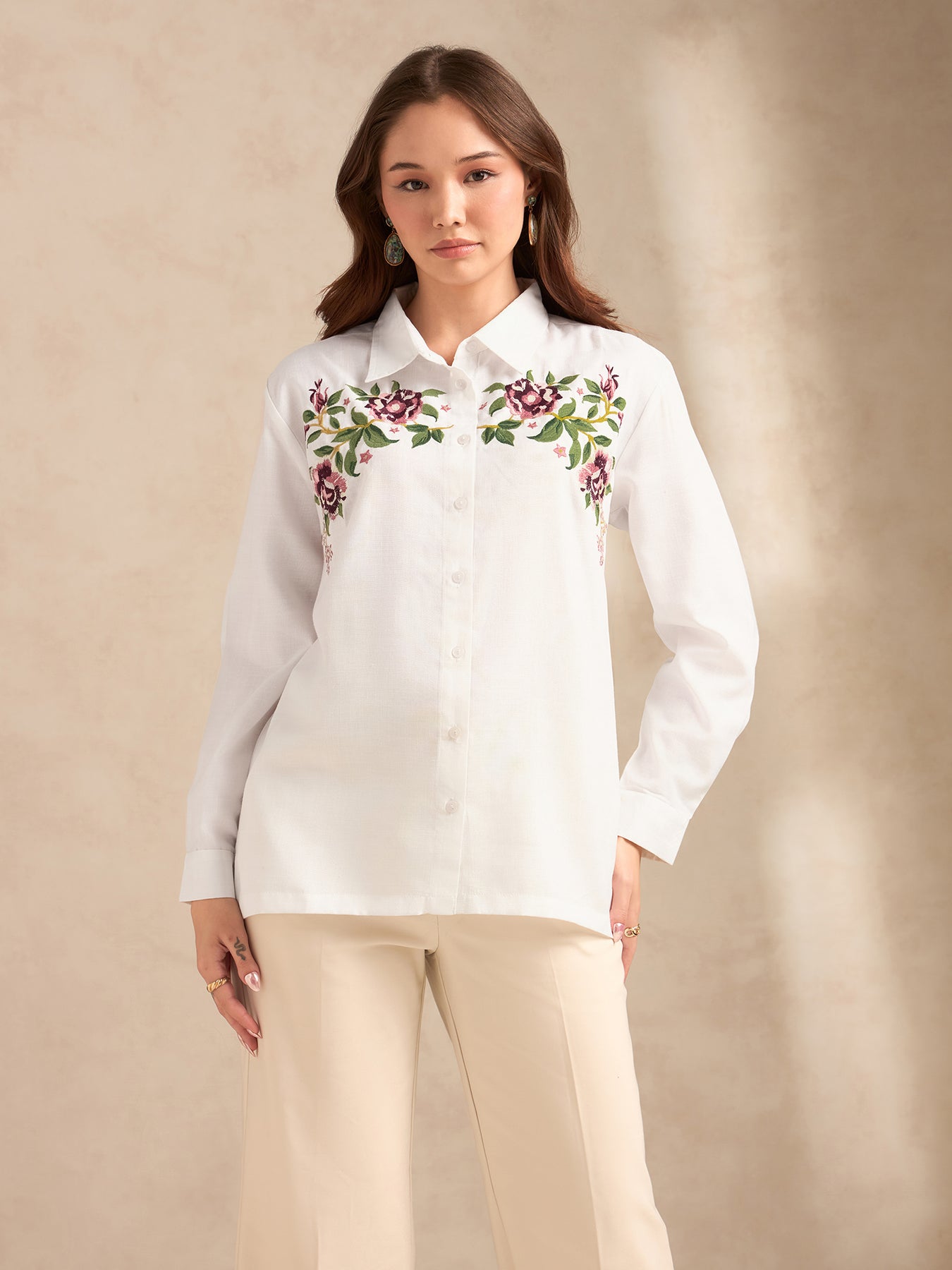 Off White Boxy Shirt With Embroidery Detail