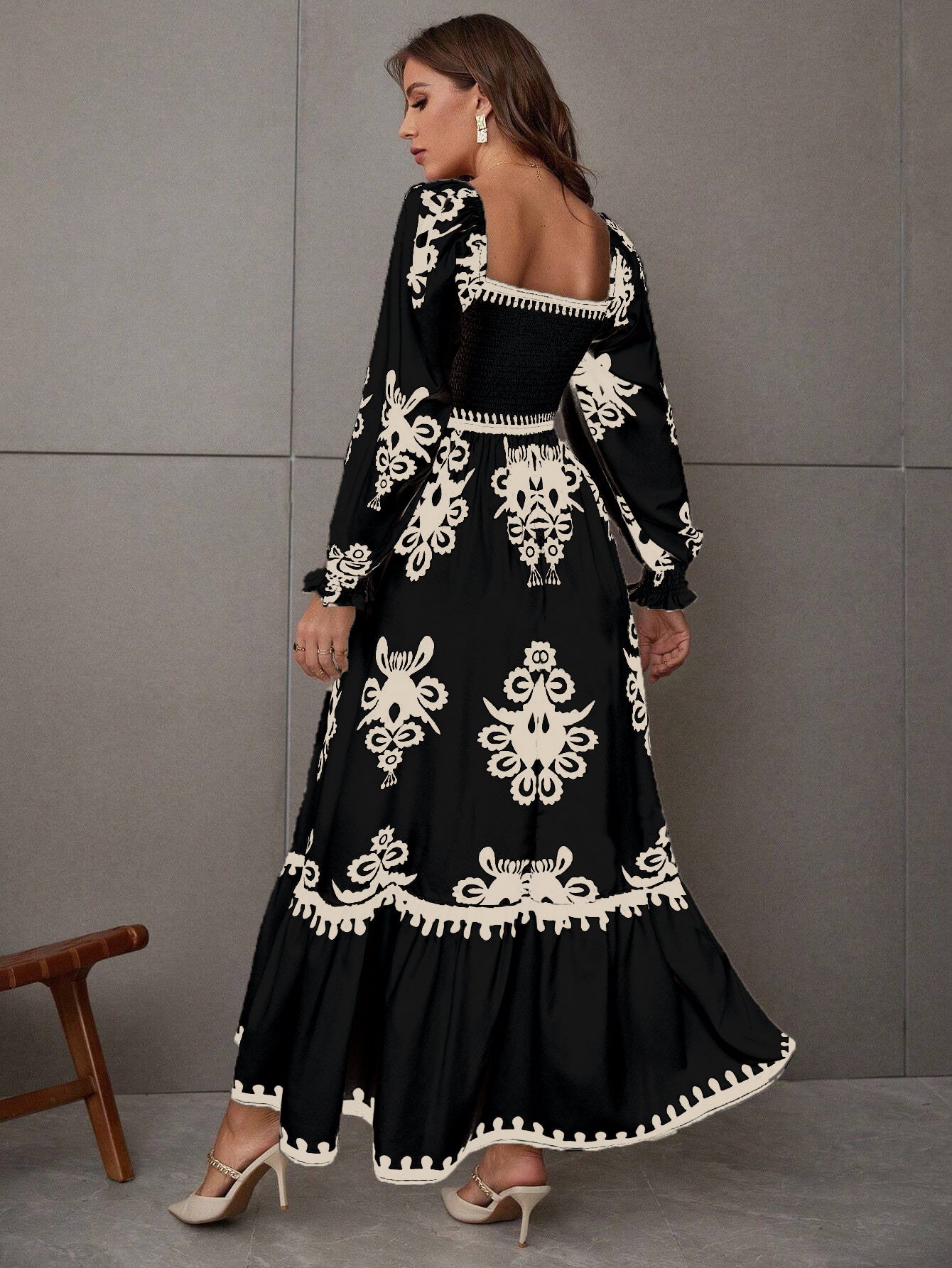 Black Bishop Sleeve Square Neck Printed Dress