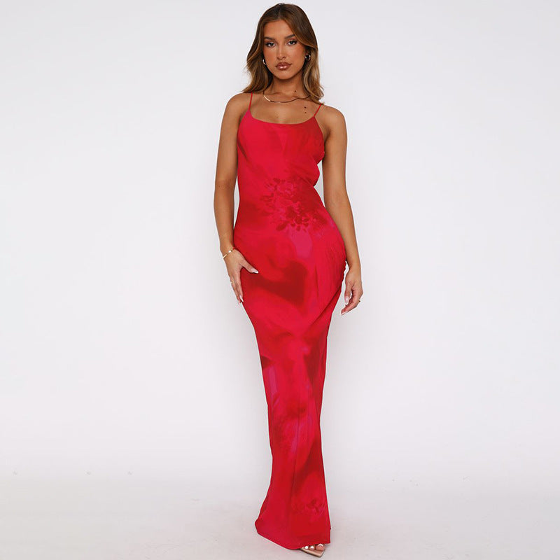 Red Spaghetti Strap Printed Bodycon Maxi Dress