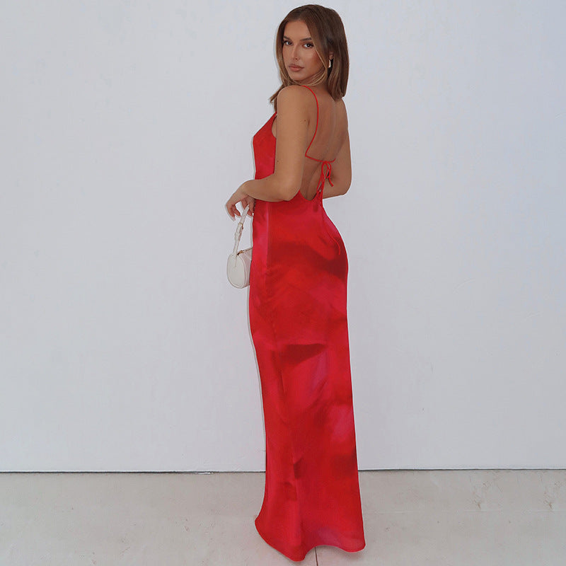 Red Spaghetti Strap Printed Bodycon Maxi Dress