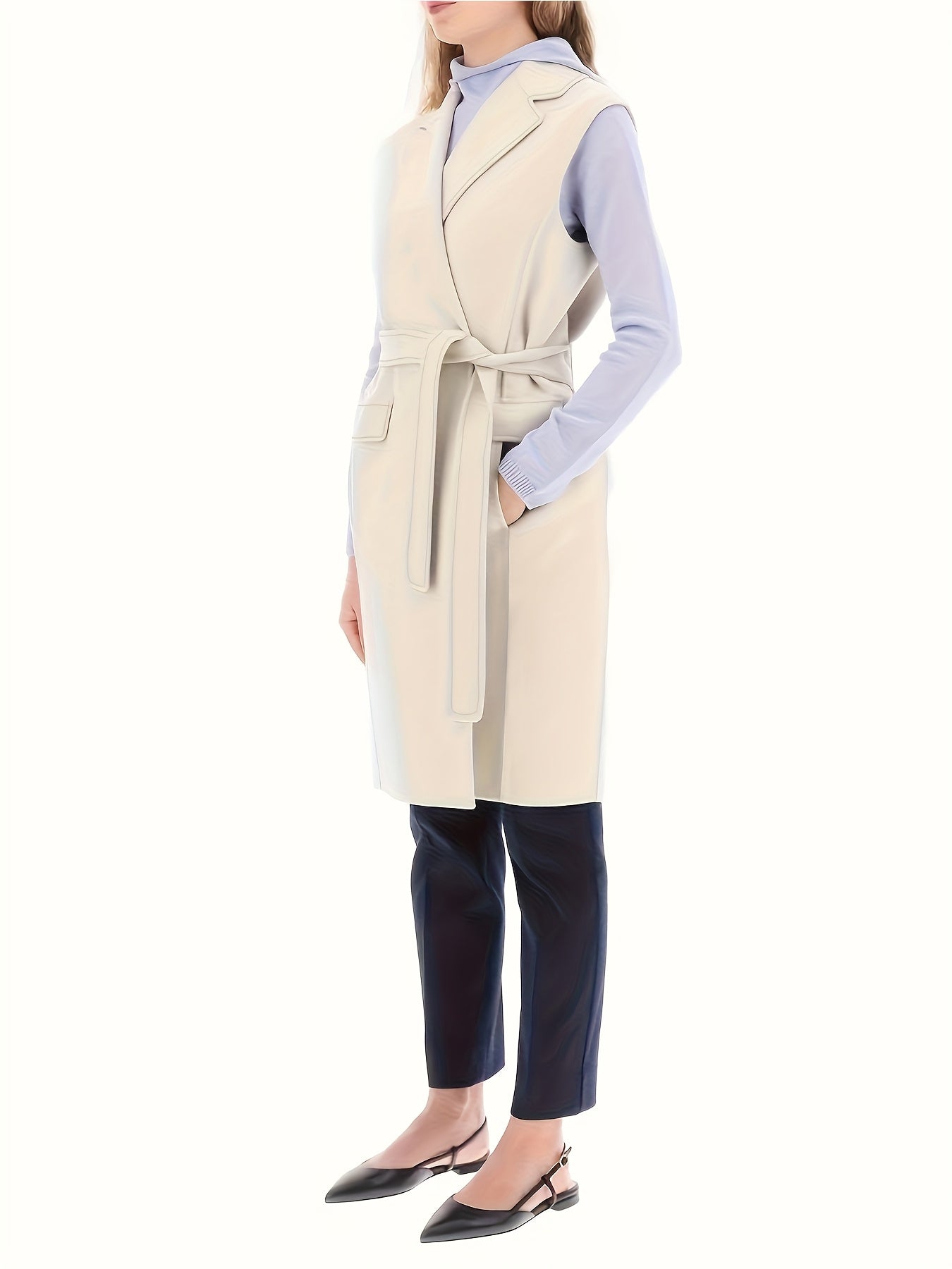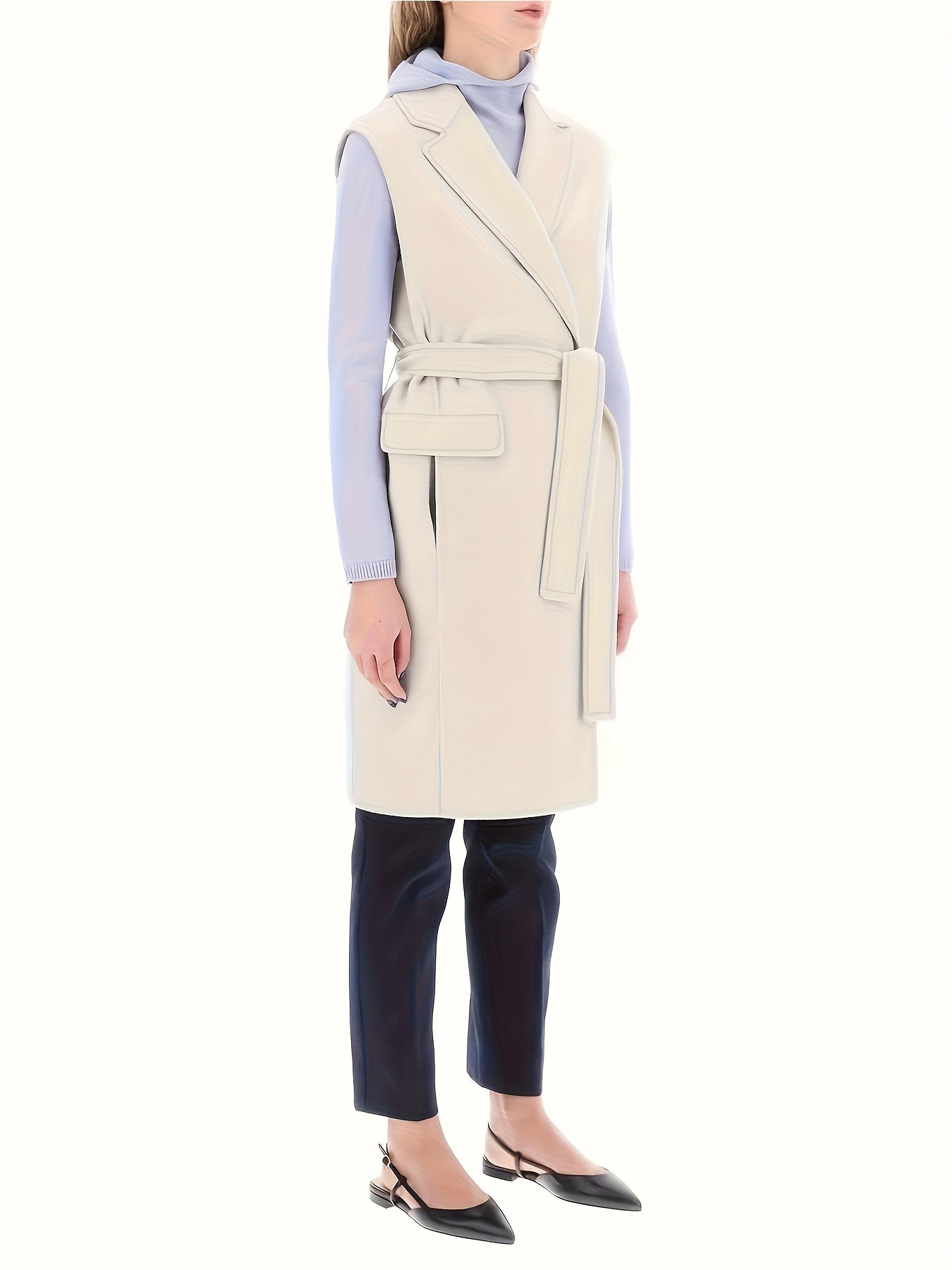 Beige Midi Length Winter Sleeveless Coat With Self Tieup Belt