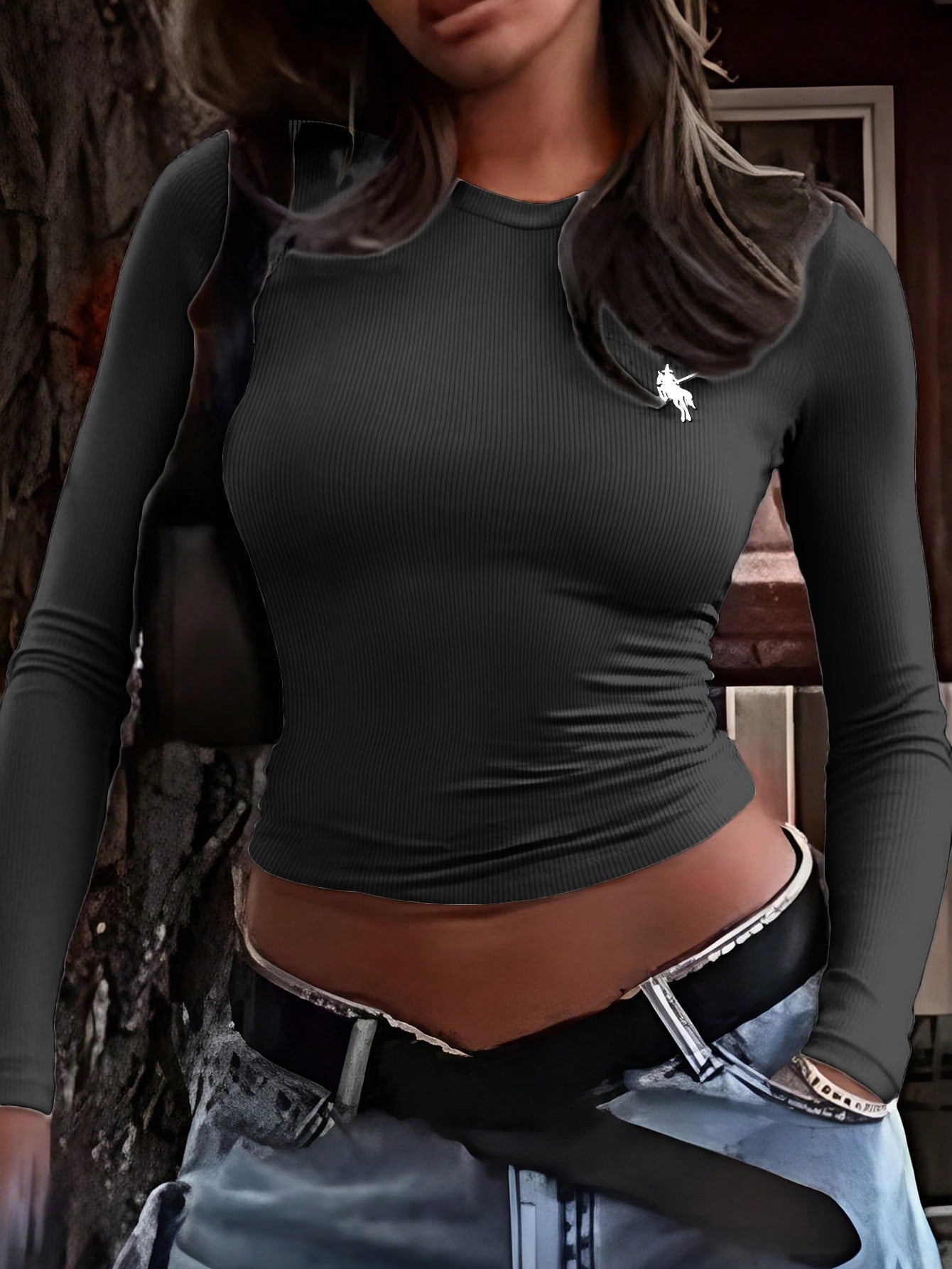 Black Full Sleeve Crew Neck Abstract Printed Fitted Top