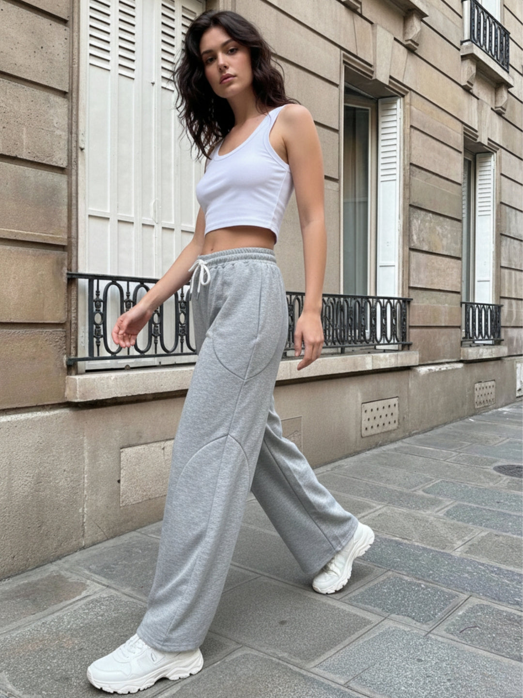 Upgrade your athleisure wardrobe with these grey baggy-fit sweatpants featuring a modern contrast stripe. The relaxed silhouette and sporty detailing are ideal for travel or casual grocery runs. Pair them with a fitted crop top and chunky sneakers for a trendy, effortless street-style look.