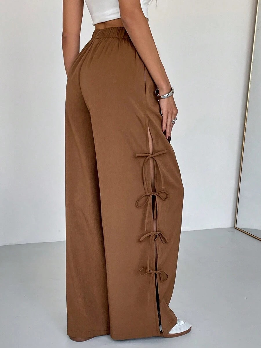 Upgrade your loungewear with these brown side-bow detailed sweatpants. The unique bow accents add a feminine touch to the classic jogger style. Ideal for travel or casual errands, they pair perfectly with a matching hoodie or a fitted tee.