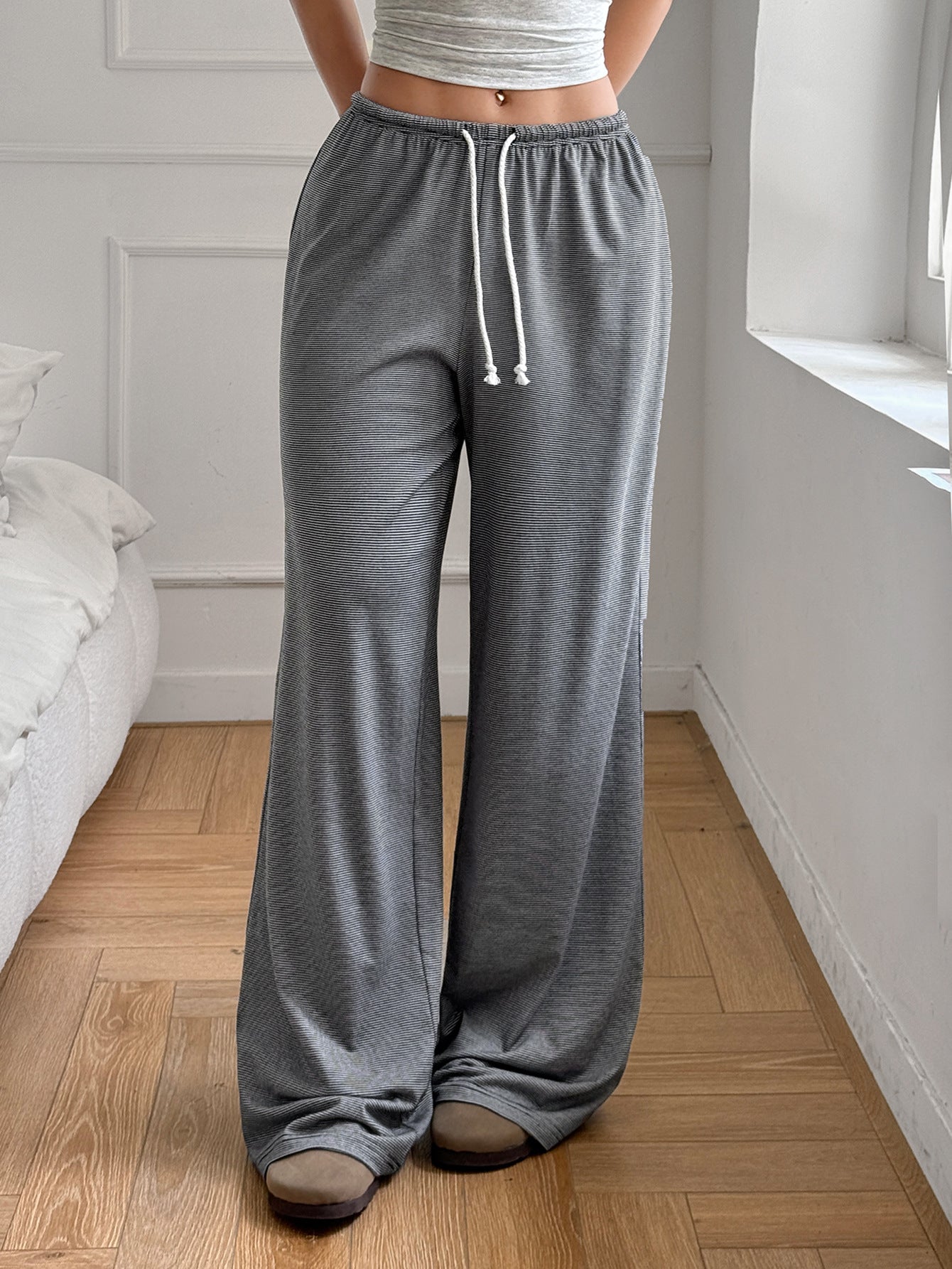 Blue Solid Wide Leg Drawstring Pant