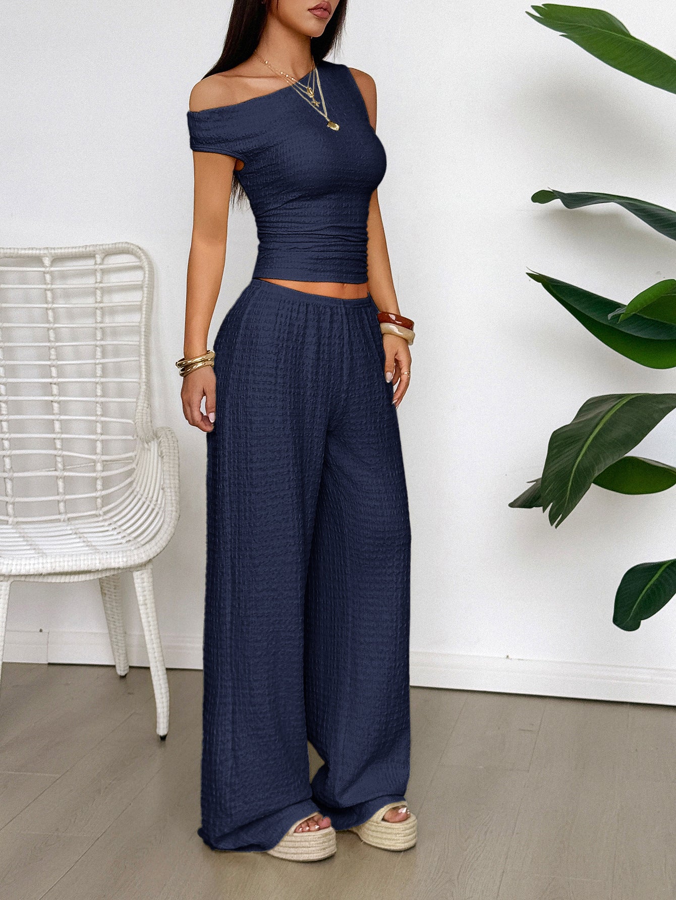 Navy Blue Textured Top And Pants Co-Ord Set