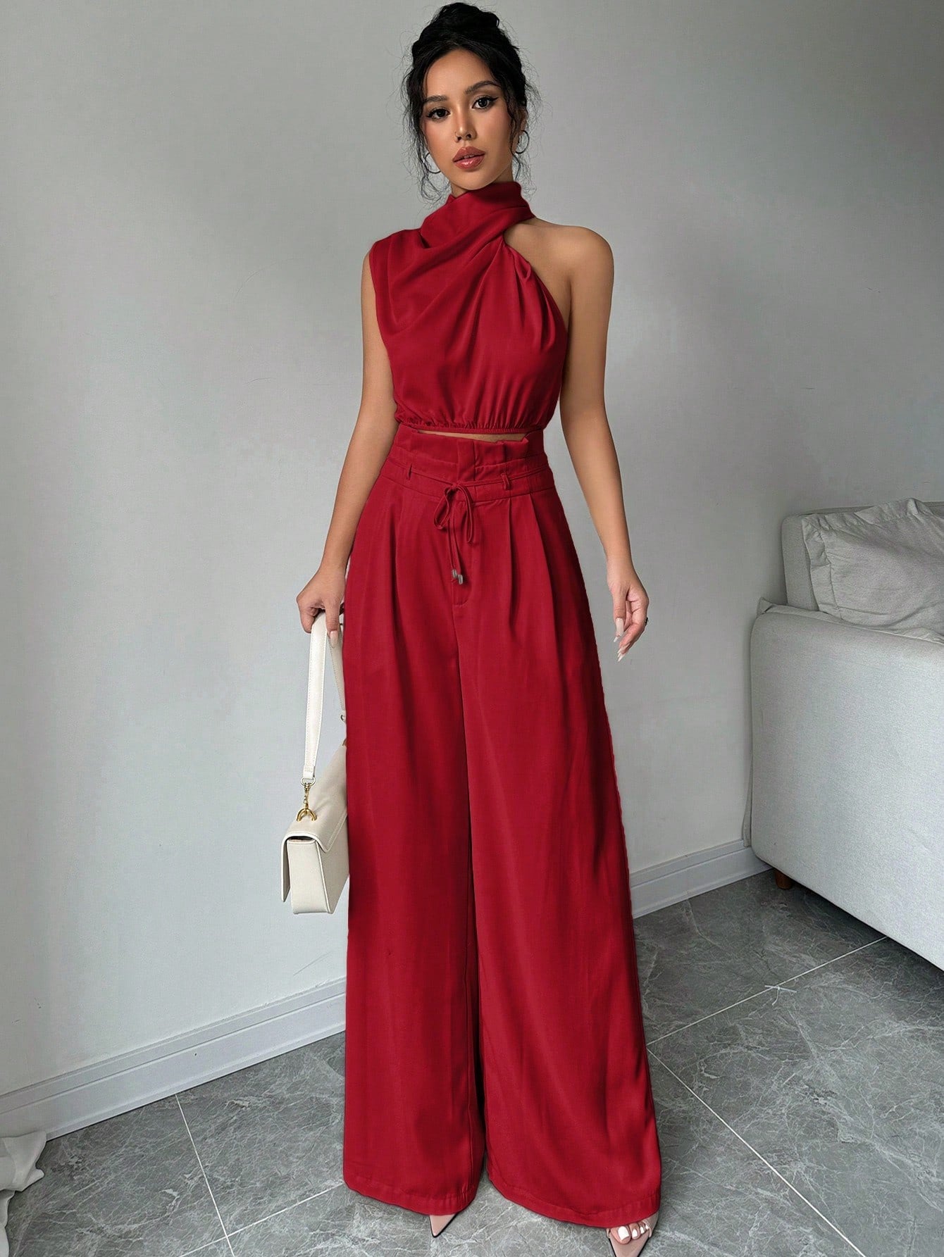 Red Asymmetrical High Neck Top with Wide Straight Pant Co-Ord Set